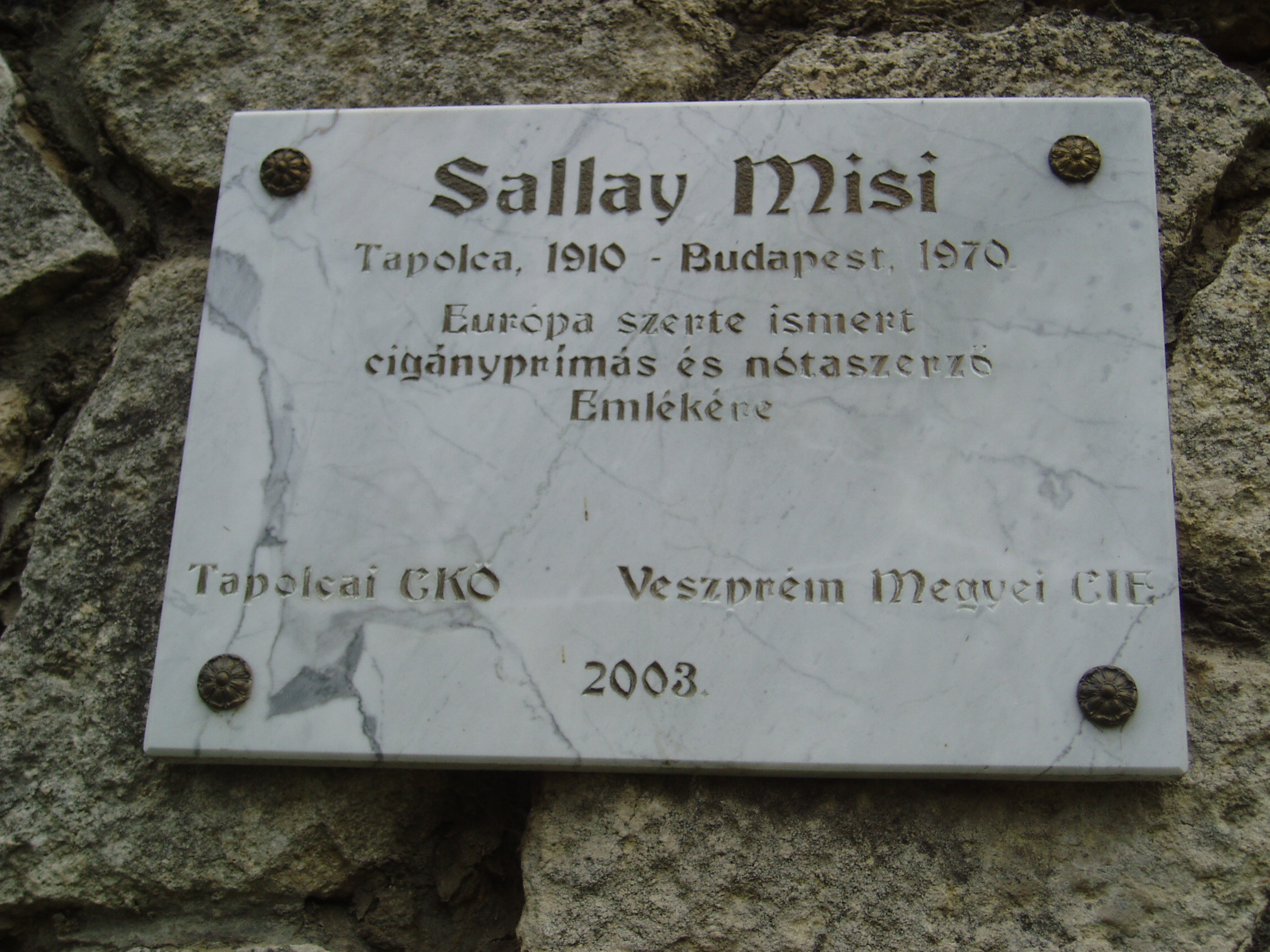 Nyilvános 1022 | 1970 | Tapolca, Városi Panteonfal: Sallai Misi emléktáblája | A Malom–tó mögött álló magas kőfal a Városi Panteonfal, amelyen több neves, tapolcai kötődésű személyiségnek állítottak emléktáblát. Sallai Misi (1910-1970) Európa-szerte híres cigányprímás Tapolcán született. Emléktábláját 2003-ban avatták fel. (A szakirodalom szerint vezetéknevét i-vel írta, ezen az emléktáblán viszont Sallay alakban szerepel.) A felvétel 2007 februárjában készült. Felh. irod.: Bándi László: Emlékhelyek Veszprém megyében. Veszprém, 1996 www.tapolca.hu |