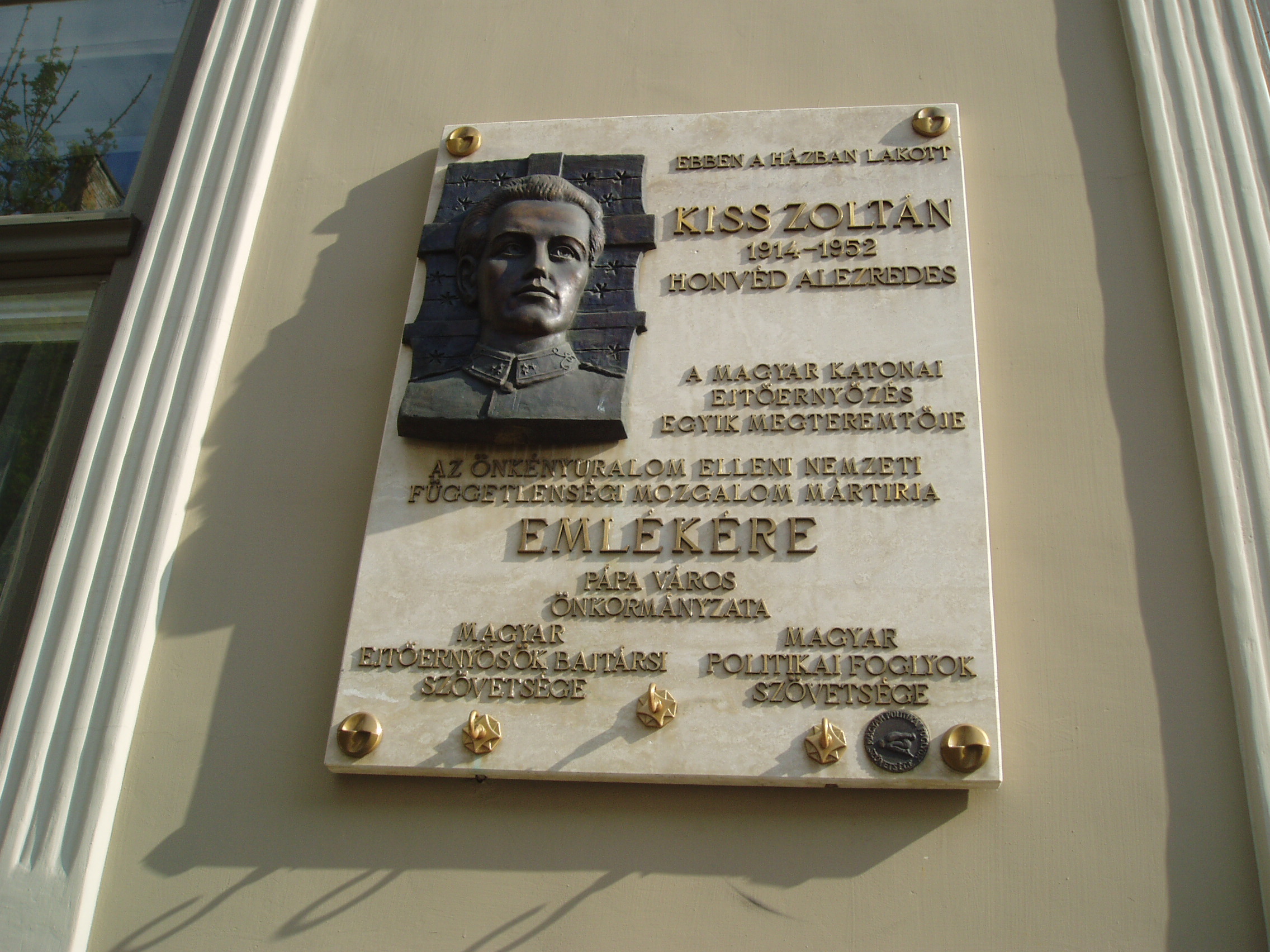 Nyilvános 1071 | 1871 | Pápa, Deák Ferenc utca 2. | Ebben a házban lakott Kiss Zoltán (Fadd, 1914. jan. 18. – Bp., 1952. ápr. 11.), a magyar katonai ejtőernyőzés egyik megteremtője. 1938-ban fiatal hadnagyként került a Bertalan Árpád által szervezett ejtőernyős kísérleti keretbe és azzal együtt Pápára. 1941-ben, Bertalan halála után az egység parancsnokává nevezték ki. 1944-ben ezredesként vett részt a második világháborúban. 1945 után a repülőakadémia ejtőernyős kiképzője volt, de 1951-ben letartóztatták, 1952-ben koholt vádak alapján halálra ítélték és kivégezték. A fénykép 2007 áprilisában készült. Felh. irod.: Veszprém megyei életrajzi lexikon. Veszprém, Veszprém Megyei Önkormányzat Közgyűlése, 1998 Veszprém megyei életrajzi lexikon. Veszprém, Veszprém Megyei Önkormányzat Közgyűlése, 1998 |