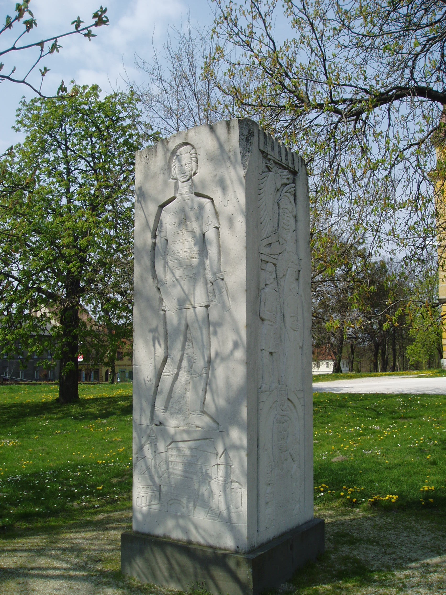 Nyilvános 1077 | 1729 | Pápa, Fő tér 1-3. Jókai-oszlop | Az Esterházy kastély előtti, a Fő tér felé néző parkban két egykori pápai diák - Jókai Mór és Petőfi Sándor - emlékére állított szoborkompozíció áll. Jókai Mór emlékoszlopa Szervátiusz Jenő és Szervátiusz Tibor alkotása. A négyzetes hasáb alakú mű felületét Jókai Mór és regényalakjainak domborműves ábrázolásai borítják. A fénykép 2007 áprilisában készült. Felh. irod.: Németh Adél - Szabó Lajos: Pápa. Bp. Panoráma, 1989 |