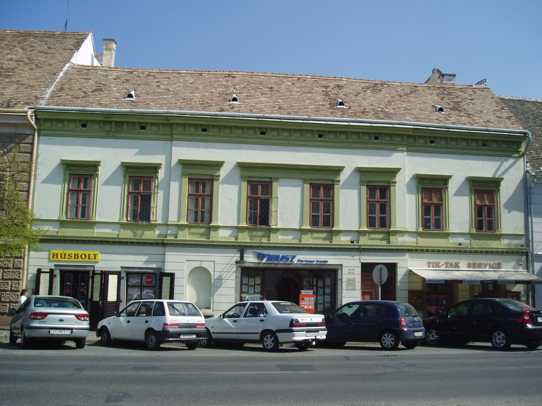 Nyilvános 1044 | 1586 | Pápa, Fő utca 4. | A Baranyay, illetve azt megelőzően Eőry-Szabó-féle ház egyemeletes, U alaprajzú lakóház. 1760 körül épült barokk stílusban. Romantikus arculatát 1850 kürül nyerte el. Rendkívül hangulatos udvara van. Udvarán - és a Fő utca 6. számú ház udvarán - áll a Református Ótemplom, azon a helyen, ahol 1718-1752 között egy fészer szolgált az istentisztelet helyszínéül. Az ótemplom felépítését II. József türelmi rendelete tette lehetővé 1783-ban. A rendeletben előírtak betartásával a templom nem az utca homlokzatvonalában, hanem zárt udvaron és torony nélkül épülhetett csak fel. A templom a késő barokk - kora klasszicista stílusú református templomok legkorábbi képviselője. 1972-ben nyitották meg benne a Református Egyháztörténeti Múzeum kiállítását. Sajnos jelenleg (2007. április) sem az épület, sem a kiállítás nem látogatható "takarékossági okok" miatt (fényképet sem tudtam róla készíteni, csak az utcafrontról: K. K.). A fénykép 2007 áprilisában készült. Felh. irod.: Németh Adél - Szabó Lajos: Pápa. Bp. Panoráma, 1989 |