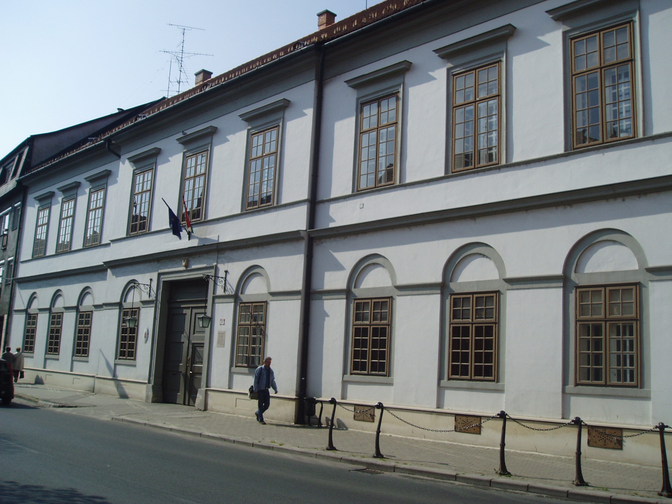 Nyilvános 1058 | 1894 | Pápa, Fő utca 17. Régi Megyeháza | A két utcára néző egyemeletes középületet 1824-ben építették klasszicista stílusban. 1732-ig Veszprém vármegyének nem volt hivatalos központja, s a megyegyűléseket elsősorban Pápán és Veszprémben tartották. 1732-ben Veszprémben felépítették a megyeházát a püspök által ajándékozott telken. Pápa azonban, ragaszkodván ősi jogaihoz, 1824-ben szintén épített egy megyeházát. Az épülethez jeles irodalmi emlék is fűződik: a pápai kollégium (lásd: Pápa, Petőfi u. 13.) önképzőköre 1842. június 30-án itt tartotta egyik ünnepi összejövetelét, amelyen részt vett Petőfi Sándor és Jókai Mór is. Petőfi - akkor még Petrovics Sándor az 1841/42-es tanévben a pápai református kollégium diákja volt. Szorosan vett iskolai tanulmányai mellett pályájára döntő hatással volt az iskola önképzőkörének - Képzőtársaságának - tevékenysége, amelyben az ugyancsak Pápán diákoskodó Jókaival, Orlai Petrich Somával és más jeles diákokkal vett részt. Az 1842. június 30-i ünnepségen az arra érdemesített diákok saját verseikkel, elbeszéléseikkel, szavalatokkal mutatkoztak be a város közönségének. Eszterházy Károly, Pápa ura pénzjutalmat is kitűzött a legjobb teljesítmények jutalmazására. Ez alkalommal Petőfi két verse is elhangzott diáktársai tolmácsolásában: Lehel című balladája, illetve a Szín és való (lásd még: Pápa, Fő tér 15.) című verse. Ő maga viszont más költőktől szavalt (akkoriban még színész szeretett volna lenni). Különösen nagy sikert aratott egy korabeli divatos verssel, Szalkay Máté: Ólmos botok című költeményével. Kölcsönkért jelmezben - lobogós ingben, pitykés nadrágban, kezében fütyköst forgatva - remekül eljátszotta a maradi korteseket parodizáló verset. Lehel című balladájával két arany pályadíjat nyert, s a jelen lévő Eszterházy grófnak annyira tetszett az Ólmos botok előadása, hogy jutalmát megtoldotta még egy arannyal. A műsoron Jókai is jelen volt, neki két elbeszéléséből olvastak fel diáktársai részleteket. A fénykép 2007 áprilisában készült. Felh. irod.: Németh Adél - Szabó Lajos: Pápa. Bp. Panoráma, 1989 "A kényes úrfi s a rongyos baka". Tanulmányok két halhatatlan pápai diákról. Pápa, Pápai Református Gyűjtemények, 2001 |