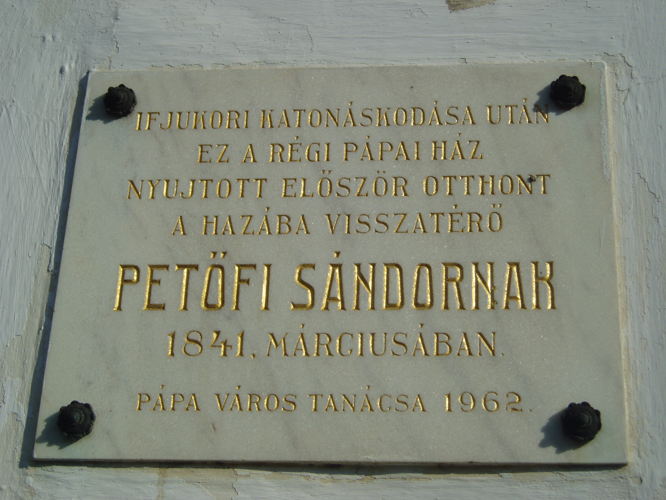 Nyilvános 1060 | 1627 | Pápa, Gyurácz Ferenc utca 18. | Mint a homlokzaton elhelyezett emléktáblán is olvasható, ebben a kis házban lelt először otthonra Pápán Petőfi Sándor 1841 márciusában. Petőfi - akkor még Petrovics - Sándor akkor szerelt le a kis híján katasztrófával végződő katonai szolgálatból, s reménytelen helyzetben volt: iskoláit félbehagyta, apja kitagadta. Ekkor ment Pápára, mert tudta, hogy unokatestvére, Orlai Petrich Soma az ottani kollégiumban tanul. Akkor ebben a kis házban egy Kis Gábor nevű diák is volt koszton-kvártélyon, s mivel Orlai Petrich még nem ért haza az iskolából, a háziasszony őt kérte meg, hogy vigye szobájába Petőfit, aki iránt külseje miatt bizalmatlan volt. Kis Gábor később így emlékezett: "Elképzelhetni, milyen lehetett a sors üldözte, ágról szakadt isten-katonája, az ő megviselt uniformisában. És ne vegye senki rossz néven, ha a rendet annyira kedvelő háziasszony ugy nyilatkozott előttem. Dehogy hitte, de ki is hitte volna, hogy az a katona egykor a Dalaim és Magyarország annyi dalainak szerzője. Bementem Petőfiért, ott ült a háziasszony szobájában egy széken, a 'sárgapitykés, zöldhajtókás közlegény': mellette a padlón ellapulva hevert az üres vászontarisznya, a bot az ágynak támaszkodott görcsös fejével ... Magam bemutatása rövid volt, mit is mondhattam volna sokat, a lábain céhláda nagyságu bakancsokban előttem álló Petőfit vendégemül meghívám, ő vette a botot és a tarisznyát s mentünk ... a mi szobánkba... Hazajött Orlay ... A legelső estét a mi szobánkban töltöttük; ... a barátság melegénél, mert borunk kevés volt, felmelegedett az elcsigázott, vézna alaku költő, csak hamar láng csapott ki homlokán, szavalt idegen költők műveiből, Horác ódáit egymásután mondta könyv nélkül..." Körülbelül három hétig tartózkodott itt Petőfi, amikor elhagyta Pápát, mert édesapjától megbocsátó levelet kapott. A fénykép 2007 áprilisában készült. Felh. irod.: Németh Adél - Szabó Lajos: Pápa. Bp. Panoráma, 1989 Petőfi emlékhelyek a Kérpát-medencében. Kiskőrös, 1996, Petőfi Sándor Társaság "A kényes úrfi s a rongyos baka". Tanulmányok két halhatatlan pápai diákról. Pápa, 2001, Pápai Református Gyűjtemények |