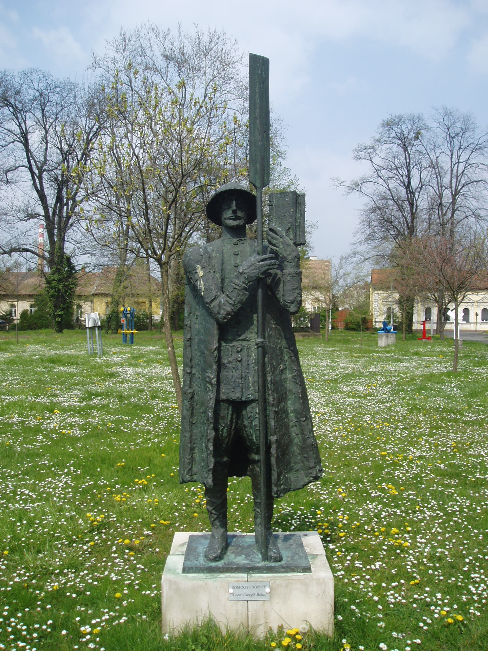 Nyilvános 1041 | 2100 | Pápa, Köztársaság liget 1.Kocsi Csergő Bálint szobra | Az 1970-es években felépített, Jókai Mórról elnevezett Városi Színház parkjában Pápához kötődő jeles személyiségek szobrait állították fel. Köztük látható Somogyi József Kocsi csergő Bálintot ábrázoló egészalakos szobra. Kocsi Csergő Bálint (Kocs, 1647. aug. – Hosszúpályi, 1711 után) író, lelkész, tanár. Református lelkészként 1671-ben hívták Pápára iskolaigazgatónak. 1674-ben a pozsonyi rendkívüli törvényszék a Wesselényi-féle összeesküvésben való állítólagos részvétele miatt több lelkésztársával együtt gályarabságra ítélte. Kiszabadulása után Svájcba ment, csak 1678-ban térhetett vissza Pápára, ahol 1683-ig tanított. Mezőörs, majd Lepsény után 1693-tól 1695-ig harmadszor is a pápai kollégium rektora lett. 1698-ban Hosszúpályiba vonult vissza. Gályarabságát elbeszélő emlékirata kordokumentumként és művészeti alkotásként is jelentős. Híres “orátiós” könyvét ma is őrzi a pápai ref. könyvtár. Ezek év végi beszédek, amelyeket a tanuló ifjúsághoz intézett. Főként latin nyelvűek, de öt magyar beszéd is található a könyvben. Itteni egészalakos szobrán kívül, amely a szintén pápai diák, Somogyi József alkotása, a református gimnázium (lásd: Pápa, Március 15. tér 9.) és a református templom falán is látható emléktáblája. A fénykép 2007 áprilisában készült. Felh. irod.: Veszprém megyei életrajzi lexikon. Veszprém, Veszprém Megyei Önkormányzat Közgyűlése, 1998 |