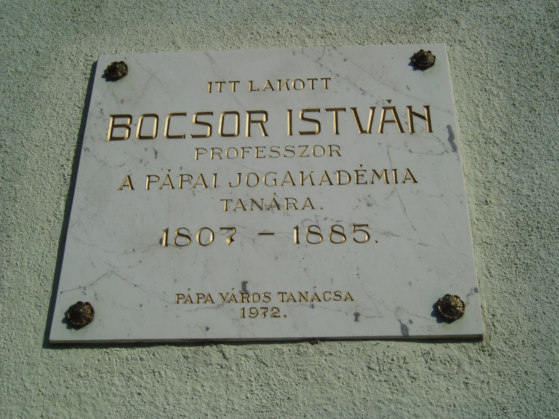 Nyilvános 1137 | 2596 | Pápa, Széchenyi utca 10. | A városi lakóház többszörös kultúrtörténeti jelentőséggel bír. Itt, a ház utcafronti részében lakott Bocsor István (1807-1885), a pápai református kollégium (lásd: Pápa, Petőfi u. 13.) egyik nagy tanáregyénisége. Tanulmányait is abban az iskolában végezte, s 1837-ben lett az intézmény tanára. Magyar nyelvű történelemórái a város közönségére is nagy hatást gyakoroltak. Latin nyelvtana öt kiadást ért meg. 1848-ban az enyingi kerület nemzetgyűlési képviselője volt. A szabadságharc bukása után visszavonultan csak pedagógiai munkásságának élt. Az 1885-ben elhunyt tanár sírja az Alsóvárosi temetőben van (lásd: Pápa, Alsóvárosi temető: Bocsor István sírja). Egykori lakóházán 1972-ben avattak emléktáblát. Alakját a ház másik lakója, a költő Kozma Andor "Karthagói harangok" című versében örökítette meg: A pápai öreg kollégyiom terme Csupa vén diákkal zsúfolásig telve. Ajkuk néma, mint a faragott képnek, Pedig verekedő vad fickók lehetnek.: Több homlokon, arcon beforradt sebhelyek, Kemény hideg-vasra valló emlékjelek; Van, kinek hiányzik fél keze, fél lába... Ilyenek is járnak Pápán iskolába. Ki históriában kutat világeszmét, Tudós Bocsor István professzor tart leckét. Tavaly Debrecenben még Enyéng követje, Alig egy fél éve még tömlöcre vetve, Most Bécs kegyelméből, rendőrtől figyelve, Megint katedráján a hatalmas elme. Tilalmas részére a honi történet, Hanem Kárthágórul s Rómárul beszélhet. Im beszél is bőven ékesszavú ajka, Visszatért diákok szomjan csüggnek rajta. ..."S a dicső Kárthágó, mondja a professzor, Végső viadalra keseredett ekkor. Ezer éves multját üti vala arcul, Hogyha lemond gyáván a rátukmált harcrul. maga dölyfös Róma egyedül ha támad, Nem győz hős haragján Kárthágó hadának. Barbár Masszinissza, gaz numíd szövetség, Ez pecsételé meg Kárthágó elestét. Ám Kárthágó népe a bús végveszélyben Nagyszerű halálra buzdult föl kevélyen. A nemzeti zászlók lobogtak kibontva, Tódultak alájuk, nőtt a had naponta, Kárthágói férfit asszony nem marasztott, Hont védeni mentek urak és parasztok, Kereskedőt üzlet, mesterembert szerszám Nem kötött le többé, - beálltak ezerszám. S a zsönge diákok az iskola padját Fegyverért esengve önként odahagyják... Ó, a boldog ifjak, ép erős legények, Mint irigylik őket rokkantlábú vének! S ezek is elmentek, nem sujthatva mással, Sujtani az ellent bátor, bölcs tanáccsal. ... Mily prelekció ez? Úgy zeng, mint az égbolt... Eszmél a professzor, elhallgat, - elég volt. Hogy is volt? - Kárthágó, harangok és ágyú...? Mily anakronizmus, tudatlan és bárgyú! S mégis: a teremben nem mosolyog senki, Csönd van...tüzes arcok...s könnyezik mindenki. Nem szól a professzor; ha még szólna: torkán Kitörne, mely fojtja, a zokogás-orkán. Ül sokáig némán, sóhajt keserveset: "S Kárthágó - elesett." A fénykép 2007 áprilisában készült. Felh. irod.: "A kényes úrfi s a rongyos baka". Tanulmányok két halhatatlan pápai diákról. Pápa, 2001, Pápai Református Gyűjtemények |