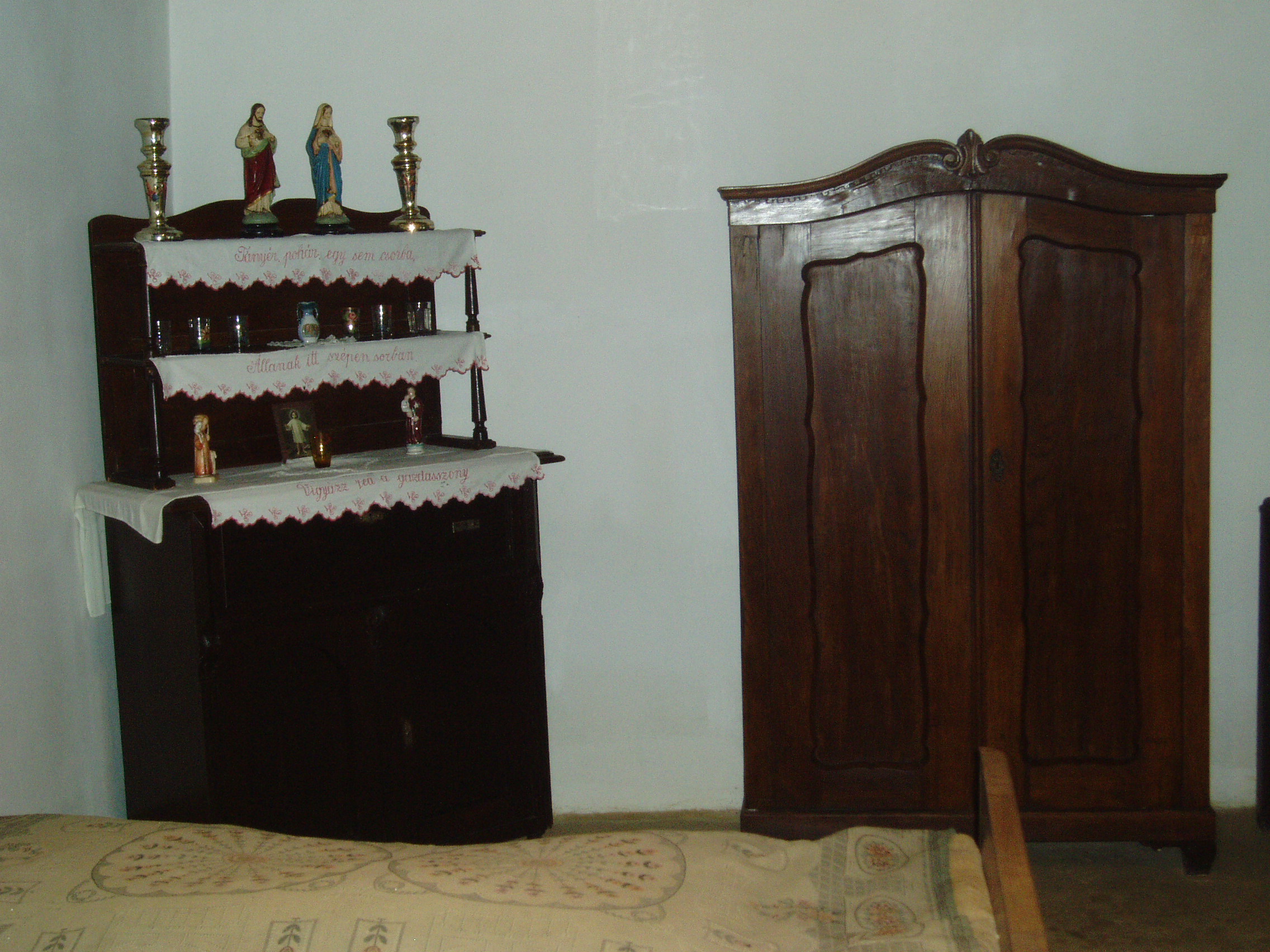 Nyilvános 1253 | 2757 | Bazsi, Fő út 149. | 1926. szeptember 16-án itt, az udvari házrészben született Simon István költő. A kis épületet 1983. április 11-én, a költészet napján, országos ünnepség keretében avatták emlékházzá. Benne ma is a költő szüleinek eredeti bútorai és tárgyai láthatók, Simon Istvánról szóló dokumentációval kiegészítve. Simon István tizennyolc éves koráig élt Bazsiban. A sümegi gimnáziumot bejáró diákként végezte el. 1948-tól Budapesten lakott, de gyakran hazajárt szülőfalujába. Számos, ebben a házban készült fényképen látható idős szüleivel a már nagy elismertséget elért költő. 1975 nyarán nagybetegen került a sümegi kórházba, ahol július 6-án elhunyt. Kívánságának megfelelően Bazsiban temették el (sírjánál sajnos nem jártam, a temető elég messze van a falutól - K.K.). A szegényparaszti környezet, a szülőföld, a Sümeg környéki táj mindvégig éltető eleme volt költészetének. A fénykép 2007 júniusában készült. Felh. irod.: Erős Zoltán: Magyar irodalmi helynevek A-tól Z-ig. Bp. Kis-Lant Kiadó, 1995 |
