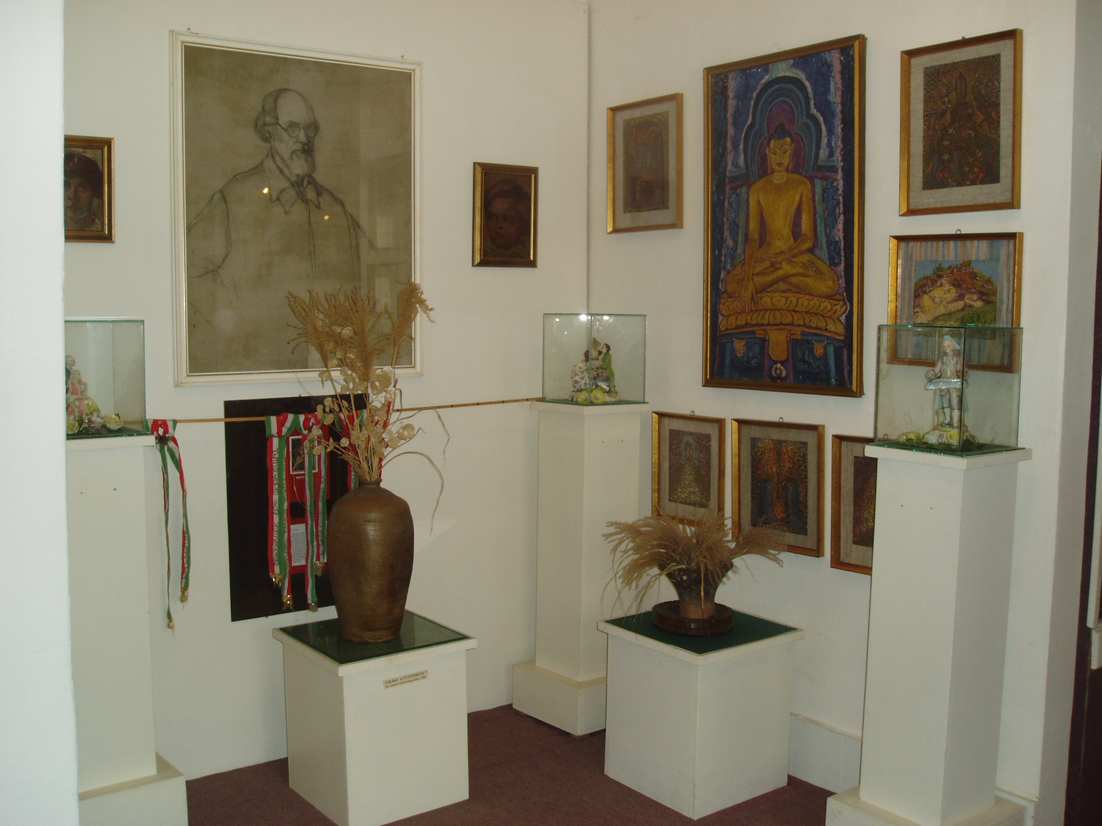 Nyilvános 1051 | 1690 | Sümeg, Kisfaludy tér 2. Városi Múzeum, Sass Brunner-emlékszoba | A Városi Múzeum ad otthont a Sass Brunner emlékkiállításnak is, amely Sass Brunner Ferenc, felesége, Sass Brunner Erzsébet és leányuk, Brunner Erzsébet festészeti munkáit mutatja be. Sass Brunner Ferenc az első világháború után telepedett le Sümegen (lásd még: Sümeg, Szent István tér 3., Sümeg, Temető). Nagykanizsai származású felesége és lánya 1928-ban Indiába utaztak és ott éltek életük végéig. Munkásságuk mára joggal bevonult a XX. század indiai festészetének klasszikusai közé. A kiállítás képanyaga jórészt Elizabeth Brunner adományaként került a múzeum tulajdonába. A művészektől a nagykanizsai Művészetek háza ("kiskastély") is őriz festményeket. A fénykép 2007 júniusában készült. Felh. irod.: Sümegi kalauz. Sümeg, Sümegi Fórum Alapítvány, 1993 |