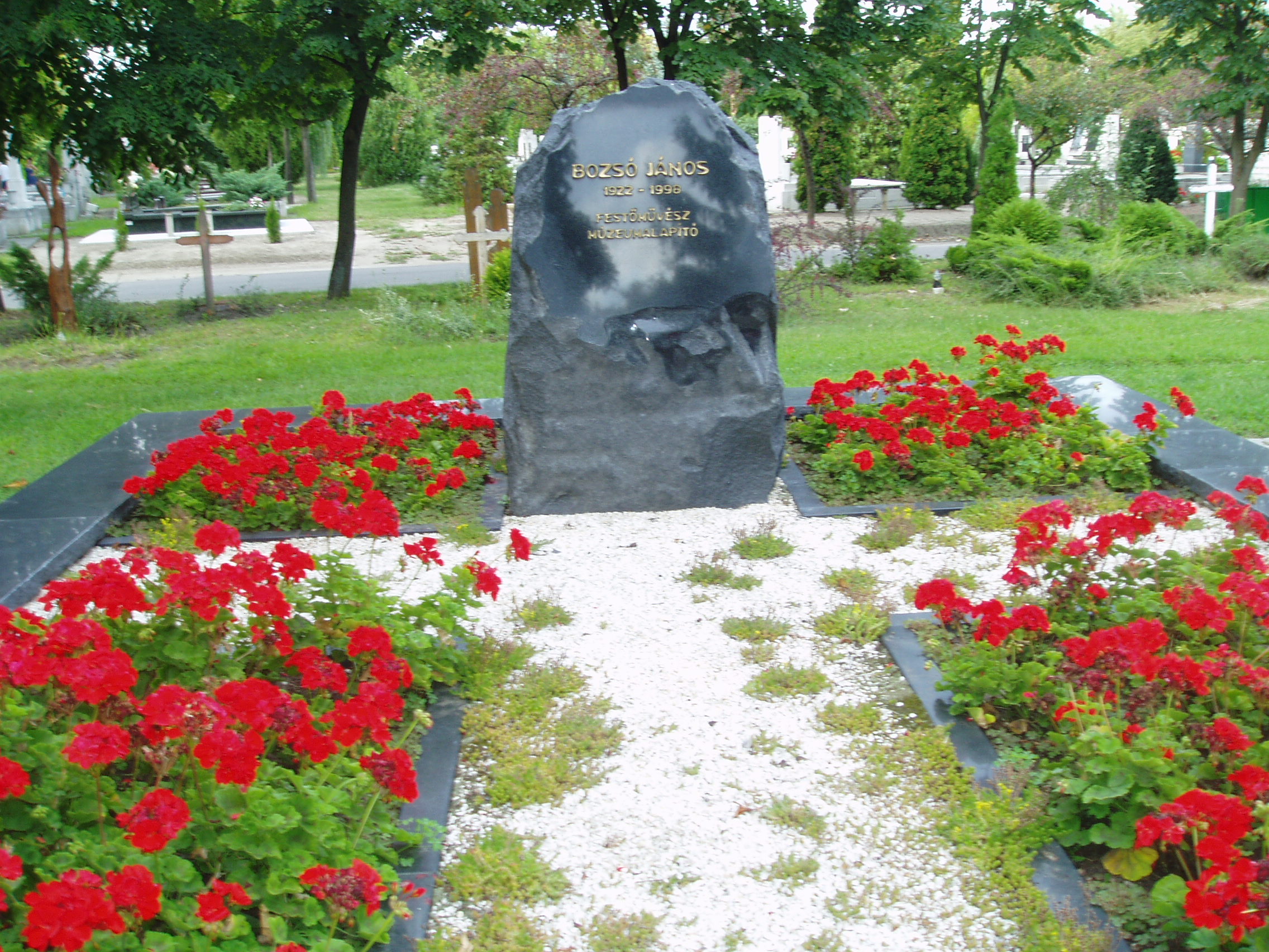 Nyilvános 1163 | 1953 | Kecskemét, Béke fasor 71/A Köztemető: Bozsó János sírja | Az 1960-as években kialakított, nyárfákkal szegélyezett Béke fasor vezet Kecskemét Köztemetőjébe. Már a bejárattól jól látható Katona József hatalmas síremléke, melynek közelében alakították ki a díszsírhelyeket, ahol a város jeles polgárai nyugszanak. Itt van a sírja Bozsó János (1922-1998) festőművésznek is. Az autodidakta festő népművészeti tárgyak gyűjtőjeként fordult az alföldi festészet felé, amelynek elismert művelője lett. Műtárgyaiból magánmúzeumot alapított, amelyet 1976-ban felajánlott Kecskemét városának. A sok ezer darabból álló Bozsó gyűjtemény 1979-ben nyílt meg a nagyközönség előtt, s a festőművész egykori lakóházában látogatható (lásd: Kecskemét, Klapka u. 14.). A fénykép 2006 augusztusában készült. Felh. irod.: Heltai Nándor: Kecskemét. Kecskeméti Lapok, 1998 www.artportal.hu |