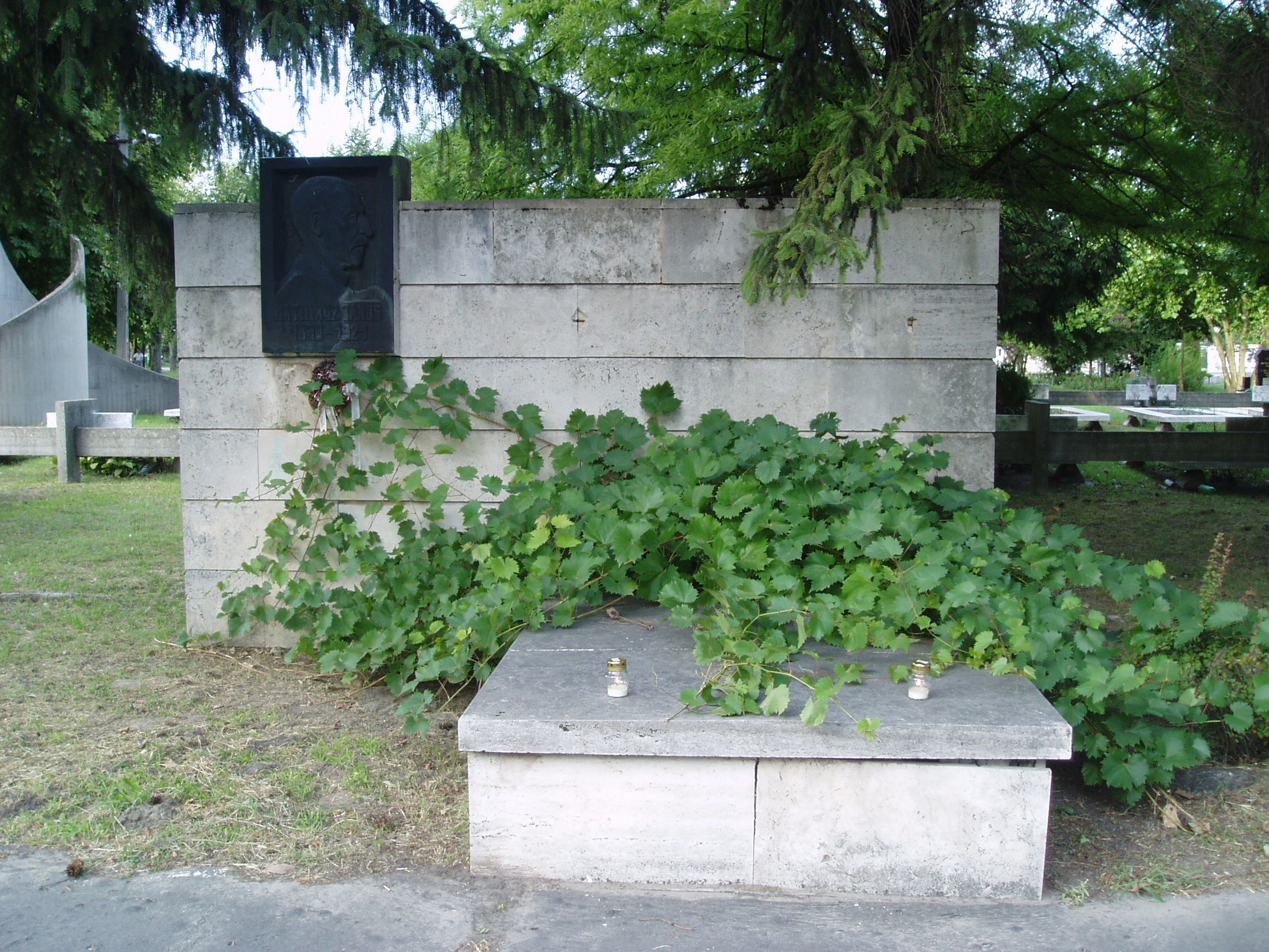 Nyilvános 1125 | 2113 | Kecskemét, Béke fasor 71/A Köztemető: Lestár Péter sírja | Az 1960-as években kialakított, nyárfákkal szegélyezett Béke fasor vezet Kecskemét Köztemetőjébe. Már a bejárattól jól látható Katona József hatalmas síremléke, melynek közelében alakították ki a díszsírhelyeket, ahol a város jeles polgárai nyugszanak. Itt nyugszik Mathiász János (1838-1921) szőlőnemesítő, számos új szőlőfajta létrehozója. A tokajhegyaljai származású mezőgazdász 1890-ben jött Kecskemétre, a környéken vásárolt birtokot. Hatalmas munkát végzett: élete során mintegy 3500 hibridet állított elő, ezek közül 180-nak részletes fajta-leírását is elvégezte. Az új fajtáknak olyan „költői” neveket adott, mint például Erzsébet királyné emléke, Kecskemét gyöngye, Kecskemét kincse, Cegléd szépe, Mathiász János diadala, de szerepelnek a névadók között a magyar irodalom és történelem nagyjai is: Vörösmarty Mihály, Zrínyi Ilona, Tompa Mihály, Bem tábornok. Ma is 67, névvel ellátott fajtáját tartják számon, melyek közül 12-t világszerte ismernek, termesztenek. A két legismertebb, általa nemesített fajta a Csabagyöngye és a Szőlőskertek királynője. Jórészt neki köszönhető, hogy a magyar – főként a homoki – csemegeszőlő-termelés magas színvonalra emelkedett. Számos korabeli író, költő emlékezett meg a nagy borászról-szőlészről. Barátja volt Arany János, Ady Endre és Vikár Béla költő is. Kecskemét környéki birtoka a diplomáciai, politikai és honvédelmi elit találkozóhelye volt: járt nála Ferenc József és Erzsébet királyné is. "Mathiász János olyan a szőlészetben, borászatban, mint Petőfi a költészetben" - írta Arany János, míg Ady Endre ekképpen fogalmazott munkája kapcsán: "E kertek a csodák kertjei". Németh Lászlóra is nagy hatással volt Mathiász János munkássága; egyik drámájának helyszínét is róla nevezte el (Mathiász panzió). A fénykép 2006 augusztusában készült. Felh. irod.: Heltai Nándor: Kecskemét. Kecskeméti Lapok, 1998 Magyar életrajzi lexikon Elkótyavetyélt védjegy vagy világhírű hungaricum? = Menedzsment Fórum 2006. júl. 12. |