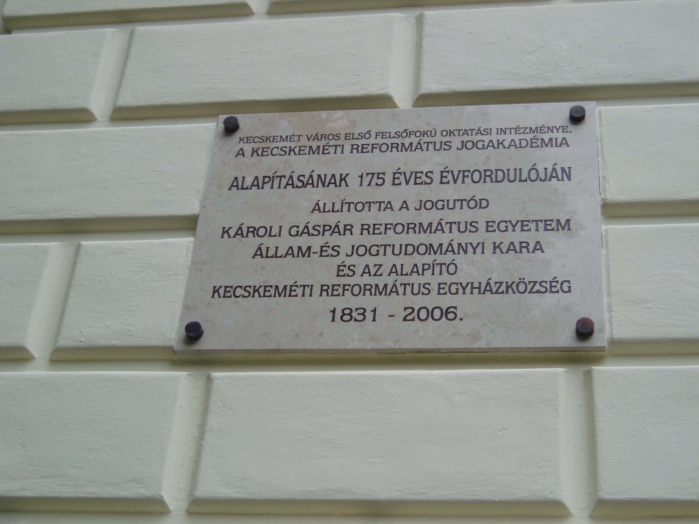 Nyilvános 1081 | 1614 | Kecskemét, Kálvin tér 1. Ókollégium | A monumentális Ókollégium, a volt jogakadémia a XIX. század elején épült klasszicista stílusban Hofrichter József tervei szerint. Kiváló diákja volt 1842-44-ben Jókai Mór, akit ebben az épületben Petőfi is meglátogatott, amikor egy vándor színtársulat tagjaként Kecskeméten időzött. Ma itt működik a Károlyi Gáspár Református Egyetem Állam- és Jogtudományi Kara, és itt kapott helyet a Ráday Múzeum. A fénykép 2006 augusztusában készült. Felh. irod.: Heltai Nándor: Kecskemét. Kecskeméti Lapok, 1998 |