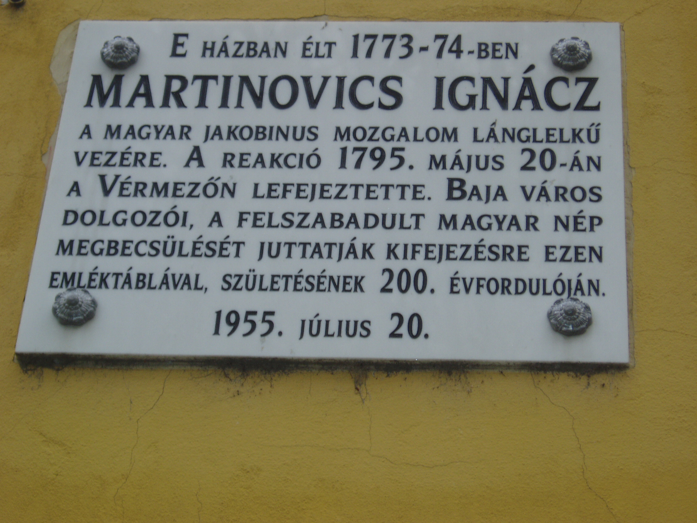 Nyilvános 1430 | 3429 | Rövid leírás | Teljes leírás (1.65 KB) | Baja, Bartók Béla utca 1-3. Páduai Szent Antal ferences kolostortemplom és rendház - Martinovics Ignác emléktáblája Baja központjában áll az egykori ferences rendház, s hozzá tapadva a kolostortemplom, más néven Barátok temploma. Baján már a XIII. századtól jelen voltak a ferencesek. A szerzetesrend a török kiűzése után, a XVII. század végén tért vissza, köztük jónéhány bosnyák származású szerzetes is volt. A település régi templomának helyén először rendházukat építették fel, alapkövét 1722-ben rakták le. Az épület eredetileg barokk stílusú volt, azonban az átépítések miatt ez külső képén kevéssé látszik. Némileg megmaradt udvarának és folyosóinak barokk kiképzése. 1772/73-ben e falak között élt és tanult Martinovics József, s itt tett szerzetesi fogadalmat 1773. április 24-én (emléktáblája egy évvel későbbi évszámokat említ). A barokk stílusú templomot 1730 körül kezdték építeni, majd 1780-ban átalakították. Mai arculatát 1930 körül nyerte el, tornyát 1902-ben építették újjá. A szoborkert felé néző Mater Dolorosa szobor Baja legrégibb ismert barokk alkotása, 1740-ből származik. A templom oldalánál lévő parkban állították fel a bajai születésű feltaláló, Kliegl József (lásd: Baja, Dózsa Gy. u. 18.) emlékművét, amelyet ükunokája, Kliegl Sándor szobrászművész készített. A fénykép 2007 októberében készült. Felh. irod.: Látnivalók Bács-Kiskun megyében. Miskolc, Well-PRess, 2002 www.szentantal.baja.hu www.wikipedia.org |