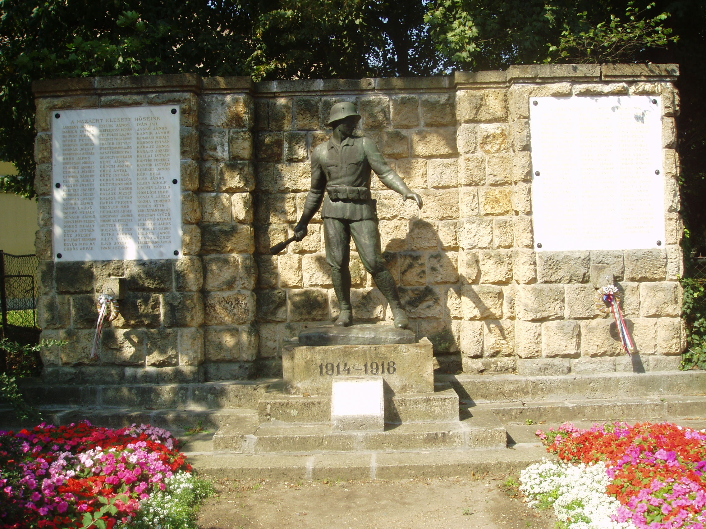 Nyilvános 1363 | 3593 | Sárospatak, Iskolakert bejárat: I. világháborús emlékmű | A Református Kollégium (lásd: Sárospatak, Rákóczi u. 1.) bejáratával szemben találjuk a hét hektáros Iskolakertet. Bejáratát két emlékmű fogja közre. A Táncsics utca felőli oldalon áll az I. világháború hőseinek emlékét idéző, gránátot dobó honvéd bronzszobra. Medgyessy Ferenc alkotását 1935-ben leplezték le. A fénykép 2007 augusztusában készült. Felh. irod.: www.vendegvaro.hu |