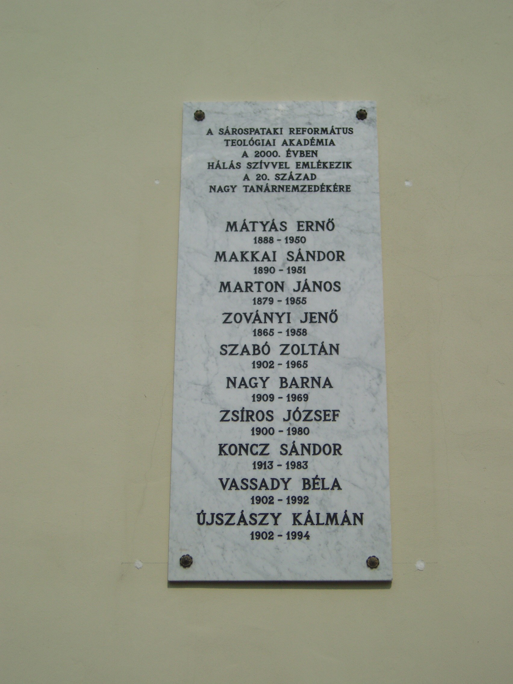 Nyilvános 1013 | 1488 | Sárospatak, Rákóczi utca 1. Református Kollégium | A Kollégium főépületének szárnyai által határolt tágas udvarban áll a régi iskolaépületek utolsó maradványa, az ún. Berna-sor. Északi falán 2000-ben helyezték el a pataki Református Jogakadémia nagy XX. századi tanárnemzedékének emléktábláját. A fénykép 2007 augusztusában készült. |