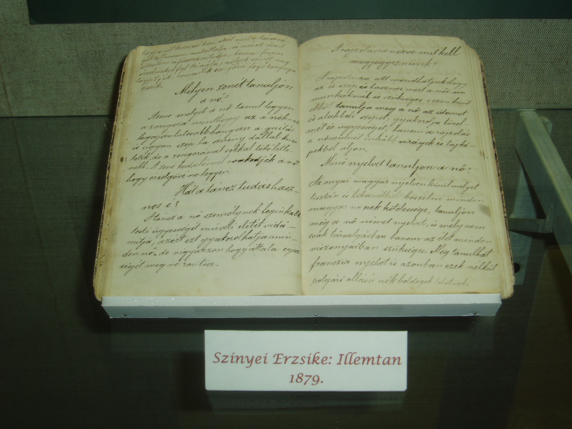 Nyilvános 973 | 1469 | Sárospatak, Rákóczi utca 1. Református Kollégium | A Kollégium főépületének szárnyai által határolt tágas udvarban áll a régi iskolaépületek utolsó maradványa, az ún. Berna-sor. 1771/72-ben a fizika oktatása számára és a fizikaprofesszor lakásául épült. Az egyemeletes, hosszú szárny déli oldalát később kétszintes, árkádos tornáccal bővítették, feljáróval a nyugati oldalon. Az épület a korabeli provinciális magyar építészet szép példája. Az emelet boltozott termeiben a kollégium történetét bemutató kiállítást rendeztek be. A képen egy XIX. századi fiatal lány, Szinnyei Erzsike 1879-ben kézzel írt illemtankönyve látható. A fénykép 2007 augusztusában készült. Felh. irod.: Détsy Mihály: Sárospatak. Bp. Corvina, 1974 |