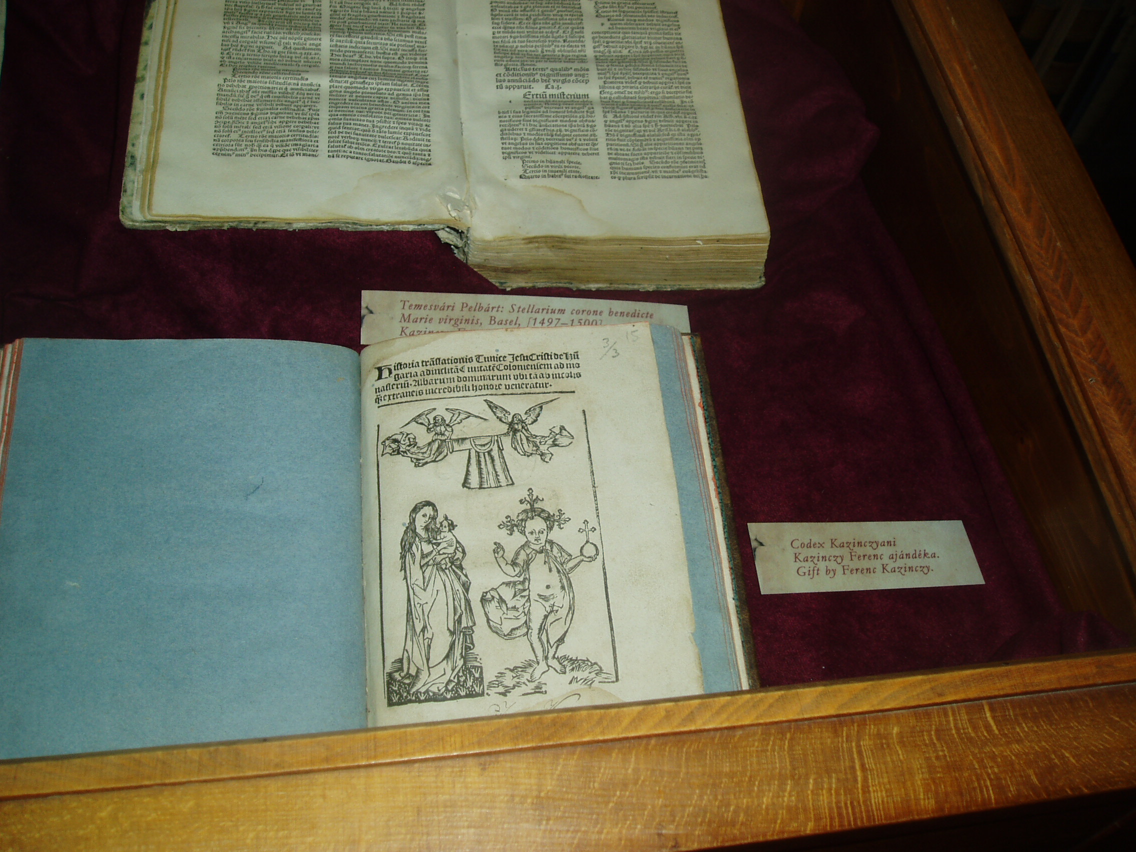 Nyilvános 982 | 1557 | Sárospatak, Rákóczi utca 1. Református Kollégium könyvtára | Az 1531-ben alapított Sárospataki Református Kollégium könyvtára évszázadok óta az ország egyik legértékesebb könyvgyűjteménye. A második világháború előestéjén, 1938-ban állománya legbecsesebb részét Budapestre menekítették. Sajnos, nem lehetett előre látni, hogy a Sárospatakot elfoglaló szovjet csapatok megkímélték a kollégiumi könyvtárat, míg a Budapestre került kötetek a hadi események során eltűntek. Sorsukról sokáig semmit sem lehetett tudni, csak harminc év múlva derült ki, hogy a Nyizsnyij Novgorod-i Lenin Könyvtár egy részlegében őrzik őket. A rendszerváltás után tárgyalásokba lehetett bocsátkozni visszaadásukról, amelyre, sok vita után 2006. áprilisában kerülhetett sor. A hazatért 16–17. századi könyvek értéke nem pusztán azért felbecsülhetetlen, mert könyvritkaságokról van szó, hanem azért is, mert az elmúlt századokban ezeket a könyveket olvasták a kollégium diákjai, tanárai. A 96 latin, 33 magyar és 6 német nyelvű könyv több mint hatvan százaléka imádságoskönyv, a többi orvosi, jogi, történeti és útleíró mű. A visszaadott dokumentumok között van a képen lent látható két ritkaság: Temesvári Pelbárt Stelláriuma (fent) és az ún. Kazinczy-kódex. A "Stellarium coronae virginis Mariae" című, Szűz Máriát dicsőítő művet szerzője akkor vetette papírra, amikor az 1479-1481. évi pestisjárvány idején betegségéből felgyógyult. Bázelben nyomtatták ki 1496-ban. Bejegyzése szerint egykor Kazinczy Ferenc tulajdonát képezte, ugyanúgy, mint az ún. Kazinczy-kódex is, amely nevével ellentétben nem kézirat, hanem szintén ősnyomtatvány s három, magyar vonatkozású történeti munkát tartalmaz. (A könyvtárban idegenvezetés közben gyorsan kellett fényképezni, ezért a felvétel nem lett igazán jó; de fontossága miatt feltettem a képek közé - K.K.) A fénykép 2007 augusztusában készült. Felh. irod.: Détsy Mihály: Sárospatak. Bp. Corvina, 1974 www.gradatio.hu/nagykonyvtar Fehér Katalin: Hazatértek a sárospataki könyvek. = Könyv és nevelés 2006. 2. Kiss Endre József: Kazinczy Ferenc pataki könyvei. = http://patakcollection.extra.hu/doku/Kazinczy.htm |