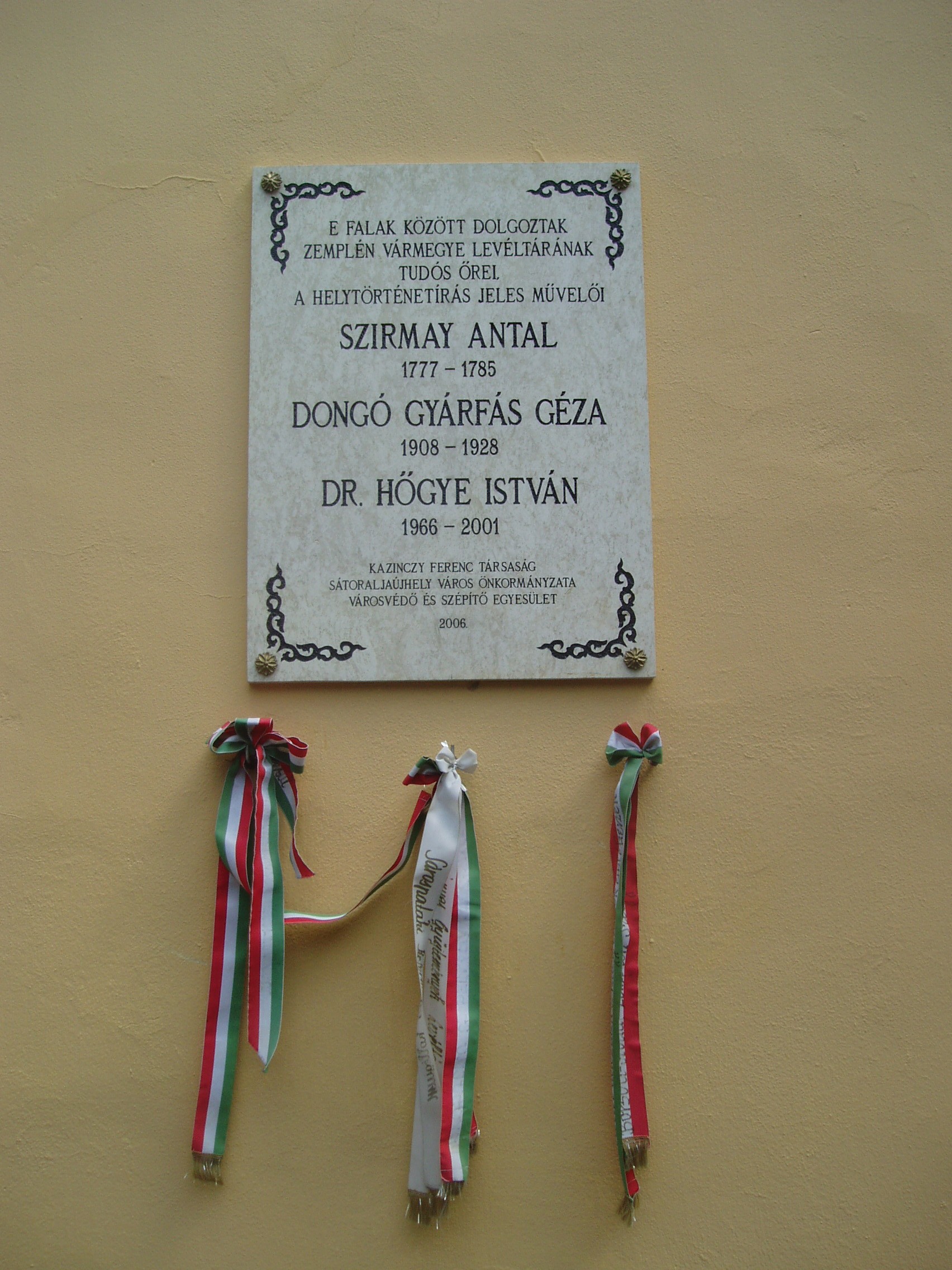 Nyilvános 974 | 1522 | Sátoraljaújhely, Kossuth tér 5. | A városháza (volt megyeháza) a fő tér hangulatát meghatározó barokk stílusban épült 1754-1768 között. Az épület északi szárnyának emeletén helyezték el Zemplén vármegye levéltárát. Berendezése műemlék: az országban szinte egyedülállóan őrzi a XVIII-XIX. századi "levelestárak" hangulatát. Az épület utcai homlokzatán - Kazinczy Ferencé mellett - ott láthatjuk a levéltár hosszú múltja három jeles alakjának közös emléktábláját. Szirmay Antal (1747-1812) történetíró alakította ki az iratok elhelyezésének logikai rendjét. Ő 1777 és 1785 között dolgozott e falak között. 1908 és 1928 között működött itt Dongó Gyárfás Géza, aki a piarista rendből kilépve állt Zemplén vármegye szolgálatába. Régészettel is foglalkozott, s megírta Sátoraljaújhely történetét. Dr. Hőgye István irodalomtörténész 1966 és 2001 között dolgozott a levéltárban, s feldolgozta nagy elődei itteni működését is. A városháza hivatali időben, a levéltár bejelentkezéssel látogatható. A fénykép 2007 augusztusában készült. Felh. irod.: Látnivalók Borsod-Abaúj-Zemplén megyében. Miskolc, Well-PRess, 2003 http://tokaj-turizmus.wplanet.hu/irodalmiut/_Toc108758785 www.satoraljaujhely.hu/nevezetessegek www.vendegvaro.hu Magyar életrajzi lexikon |