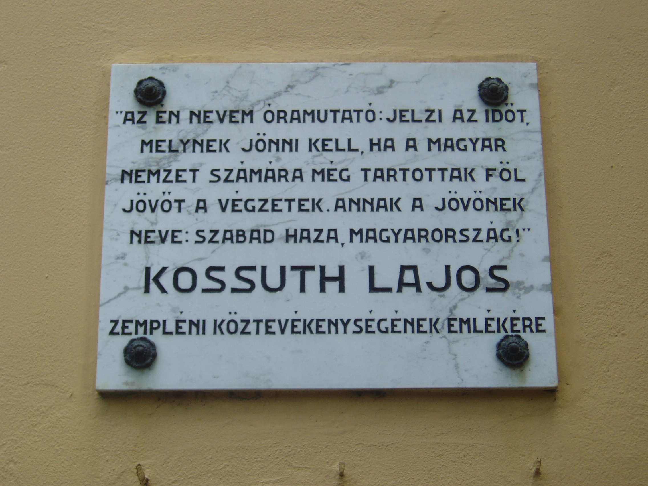 Nyilvános 1000 | 1833 | Sátoraljaújhely, Kossuth tér 5. | A városháza (volt megyeháza) a fő tér hangulatát meghatározó barokk stílusban épült 1754-1768 között. Az olasz építészek által tervezett épület impozáns méreteivel az állandóság és a méltóság érzetét kelti. A főbejárat fölötti erkély mögötti díszteremben mondta a fiatal Kossuth első szónoklatát 1831-ben, a koleralázadás idején (az útikönyvekben a beszéd helyeként következetesen az erkélyt említik). Kossuth Lajos szülei 1808. február végén Olaszliszkáról költöztek Újhelybe. 1810 és 1816 között a város piarista gimnáziumának növendéke volt. 1824-ben Pestet otthagyva visszatért Újhelyre, ahol magánügyvédként dolgozott. 1827-ben Zemplén megye táblabírája, 1830-ban Sátoraljaújhely, 1832-ben a vármegye ügyésze lett. Közéleti szereplése 1831-ben a vármegyei közgyűlésen a kolerajárvány kapcsán a jobbágyság társadalmi helyzetéről elmondott beszédével kezdődött. Kossuth többször is felszólalt az épületben, az akkori megyeházán, mint a formálódó ellenzék egyik vezérszónoka. Szokatlan és merész szónoklatait szemtanúként az idős Kazinczy Ferenc is felemlegette levelezésében. Egyik protestáló felszólalását így örökítette meg: "Erre felkele Kossuth Lajos, s oly tűzzel, mintha kezében volna a zendítés szövétneke, két kezét csípejére rakván, képzelhetetlen vakmerőséggel tartá beszédét." Kossuth sátoraljaújhelyi emlékét utca, tér, szobor, több intézmény és emléktábla őrzi. Emléktábla található egykori iskolája falán (lásd: Sátoraljaújhely, Deák F. u. 10-12.), a városháza dísztermében, illetve azon házakon, ahol egykor ő, illetve szülei, testvérei laktak (lásd: Sátoraljaújhely, Móricz Zs. u. 17. és Hősök tere 8.). A fénykép 2007 augusztusában készült. Felh. irod.: Látnivalók Borsod-Abaúj-Zemplén megyében. Miskolc, Well-PRess, 2003 www.satoraljaujhely.hu/nevezetessegek www.vendegvaro.hu Fehér József: Két újhelyi Kossuth-legenda. = Széphalom. A Kazinczy Társaság Évkönyve 12. kötet, 2002 |