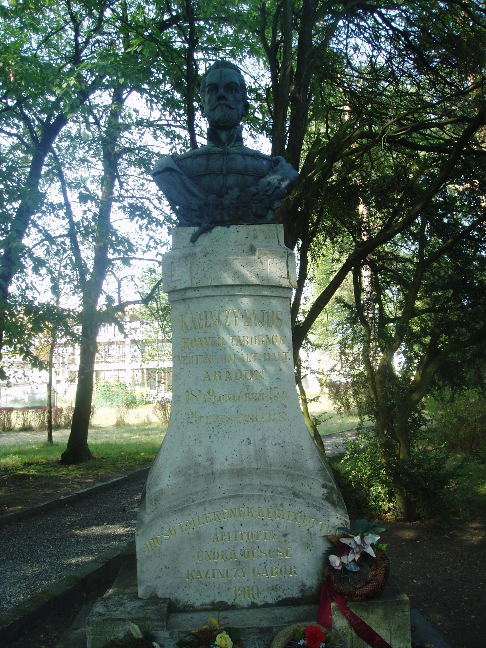 Nyilvános 1008 | 1536 | Széphalom: A Kazinczy család sírkertje - Kazinczy Lajos szobra | A Kazinczy Emlékcsarnok parkja - Kazinczy Ferenc egykori kúriájának kertje - ma természetvédelmi terület. A mauzóleumból fasor vezet a Kazinczy család sírkertjébe. A kis temető helyét 1806-ban, első gyermeke, az egyéves korában elhunyt Iphigenia halálakor Kazinczy maga jelölte ki. Már akkor megírta barátainak, hogy felesége és ő is oda fognak temetkezni. Legkisebbik fiuk, Lajos, Aradon szenvedett vértanúhalált a honvédsereg ezredeseként. 1849. október 25-én, 29 éves korában végezték ki. Földi maradványait az aradi vársánc rejti. Szülei sírjának közelében felállított mellszobra idézi emlékét. A szobor másolata a sárospataki kollégium kertjében látható (lásd: Sárospatak, Iskolakert: Kazinczy Lajos). A fénykép 2007 augusztusában készült. Felh. irod.: Látnivalók Borsod-Abaúj-Zemplén megyében. Miskolc, Well-PRess, 2004 www.vendegvaro.hu Pávai Gyula: Kazinczy Lajos emléktáblája Aradon. = Széphalom. A Kazinczy Ferenc Társaság Évkönyve 13. kötet, 2003 |
