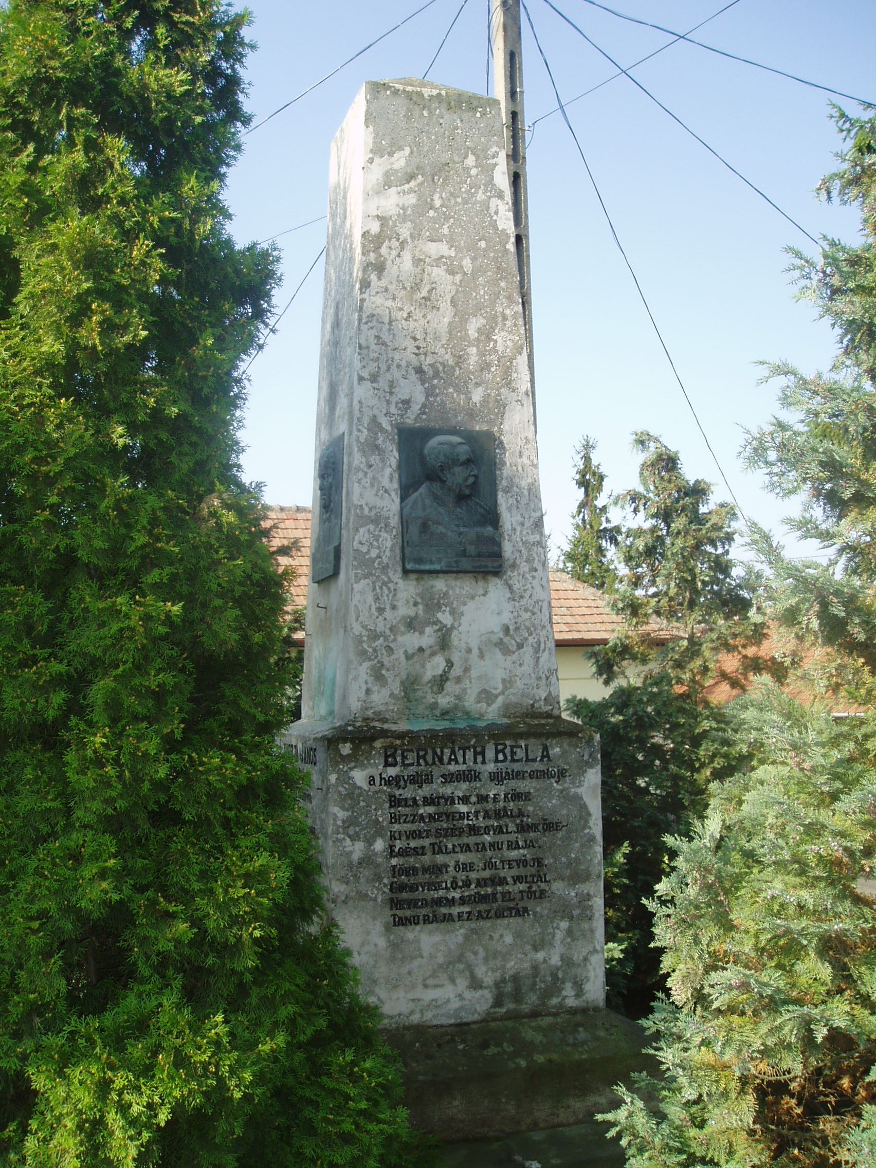 Nyilvános 1033 | 1650 | Tállya, Rákóczi utca 34. | Tállya központjában, a Polgármesteri Hivatal előtt egy 1922-ben felállított és 1994-ben felújított obeliszk látható. Három, a településsel kapcsolatba került híres személyiségnek állít emléket. Egy–egy oldalán Lavotta János, Bernáth Béla és Zempléni Árpád domborművű arcképét helyezték el, korabeli ízlésű méltató verssorokkal, a negyediken pedig a felállítás körülményeit rögzítették: Közadakozásból emelték tisztelőik és barátaik: Vikár Béla, Markó Miklós hírlapíró, Vaszari László szobrász, dr. Asztalos Kálmán, Kovács Ferenc 1922-ben. Lavotta János (1764–1820) a magyar zenetörténetben nagy szerepet játszott verbunkos triász egyik jeles tagja volt; Tállyán hunyt el (lásd: Tálly, Rákóczi u. 24.), s sírja is a helyi katolikus temetőben található (lásd: Tállya, Temető). Emlékszobája 2001. júliusában nyílt meg a Maillot–kastélyban (lásd: Tállya, Rákóczi u. 10.). Az 1878-ban született sátoraljaújhelyi főszolgabírót, Bernáth Bélát mint a hegyaljai szőlők újratelepítőjét tisztelik. A tállyai születésű Zempléni Árpád (1865–1919) — eredeti nevén Imrey Árpád — a maga korában jónevű költő volt; legnagyobb sikert aratott verseskötetének címét — Turáni dalok — is megörökítették domborművén. A fénykép 2007 augusztusában készült. Felh. irod.: Takács Péter: Tállya. Bp. Száz Magyar Falu Könyvesháza Kht., 2001. /Száz magyar falu könyvesháza/ Látnivalók Borsod-Abaúj-Zemplén megyében. Miskolc, Well-PRess, 2003 Dombóvári János: Pusztafedémestől Tállyáig. Miskolc, Szent Maximilian Kiadó, 1994 |