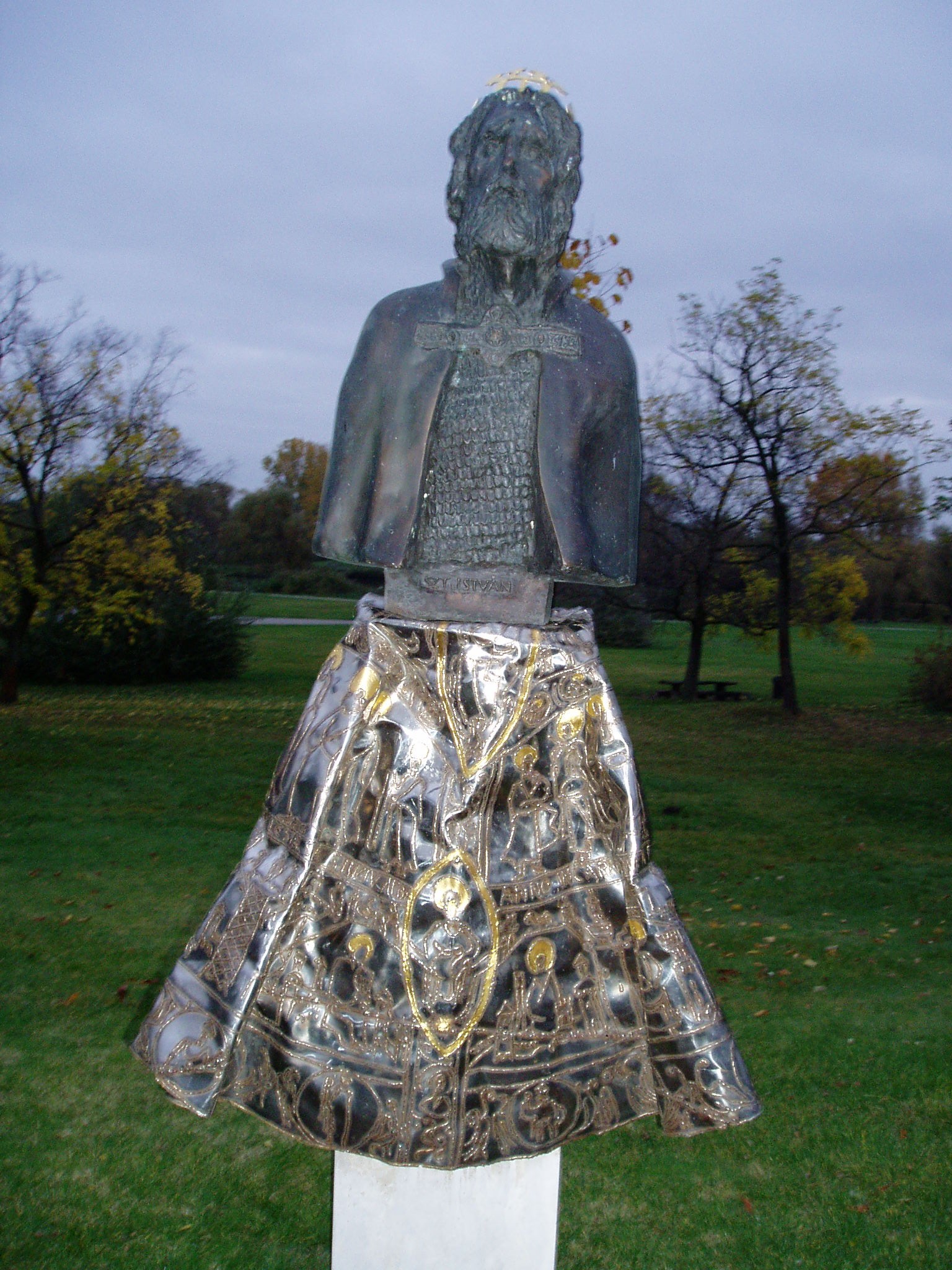 Nyilvános 917 | 1819 | Ópusztaszer: Szent István szobra | Az ópusztaszeri Megyék Történelmi Szoborparkjában Csongrád megye állíttatta I. István király szobrát, mely Varga Imre alkotása. A szobor a romantikus Szent István ábrázolásokkal merészen szakító portré, a korhű István-ábrázolások ihletett továbbgondolása. Arcvonásai felidézik a nomád elődök életvitelén edződött férfiúi jellemvonásokat éppúgy, mint az energikus, magabiztos, hatalma és ereje tudatában lévő államférfi, a keresztény király erényeit. Az aranyozott, krómacél lemezből formált koronázó palást a fél alakot tartó oltárszerű talapzatra borul, Szent István testének megformálójaként jelképesen eggyé forrasztja Szent Istvánt és művét, a keresztény Magyarország megteremtését. A fénykép 2004 októberében készült. Felh. irod.: www.csongrad-megye.hu/turizmus/szoborpark/02.htm |