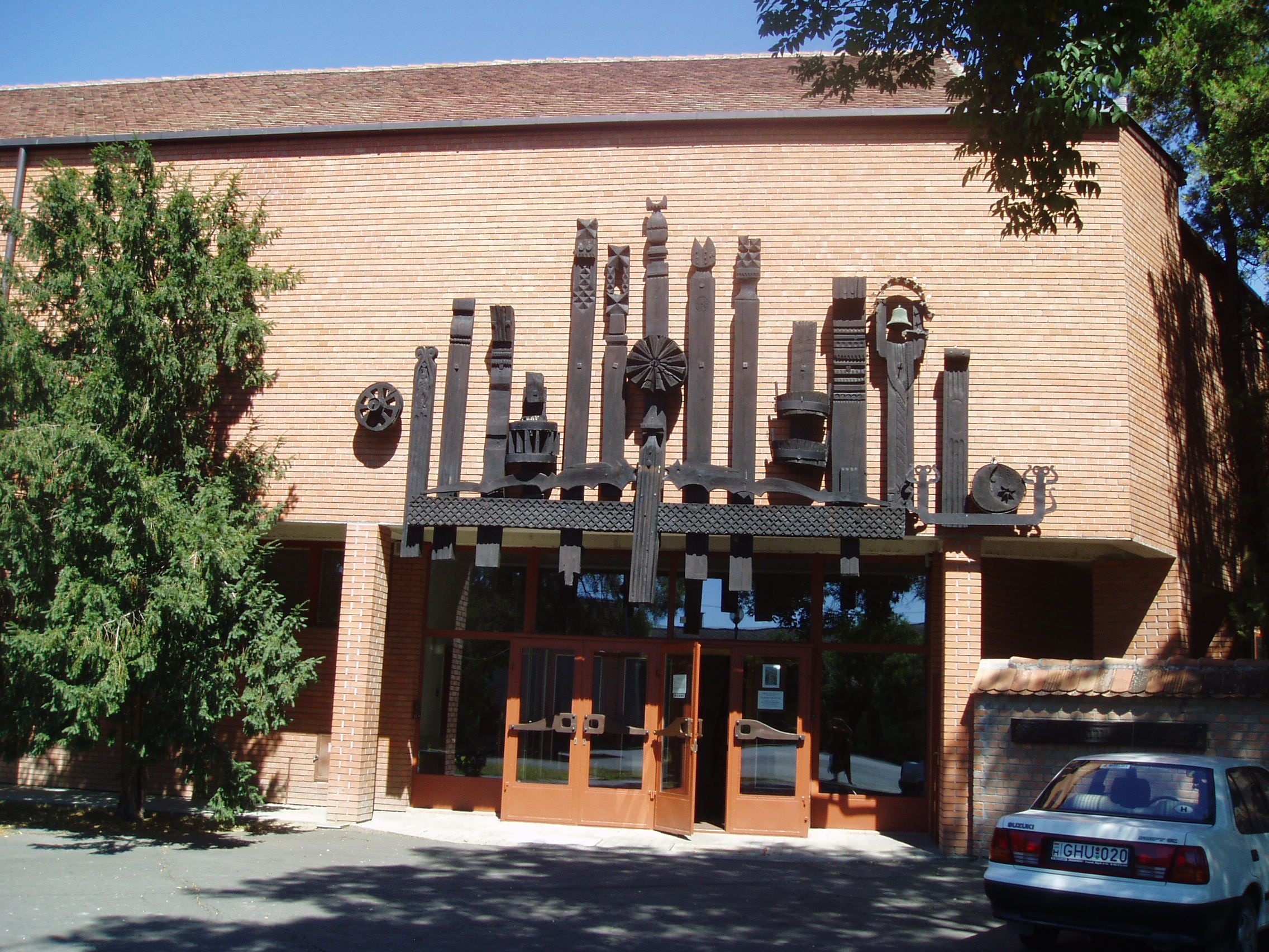 Nyilvános 955 | 1341 | Makó, Megyeház utca 4. József Attila Múzeum | A múzeum, melynek eredete 1885-re vezethető vissza, de hivatalosan csak 1950-ben jött létre, 1981-ben költözött be a Vincze Mihály által tervezett mai épületbe. A homlokzatot Varga Imre 1981-ben készített fakompozíciója díszíti. Állandó kiállítása a város hétszáz éves fejlődését mutatja be. Látványos eleme az az első világháború előtti piacot ábrázoló életkép, mely ízelítőt ad Makó gazdag népéletéből. A fénykép 2007 júliusában készült. Felh. irod.: Barangolások Csongrád megyében. Miskolc, Well-PRess, 1997 www.mfm.u-szeged.hu/index.php?id=muzeumaink-mako |