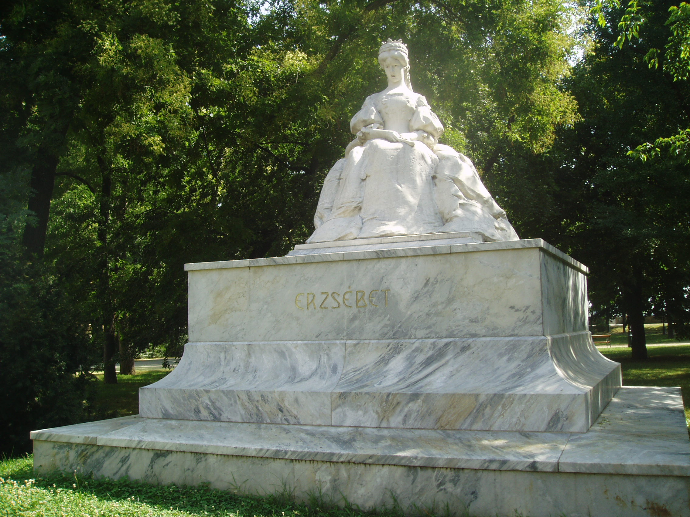 Nyilvános 1007 | 1640 | Szeged, Stefánia: Erzsébet királyné szobra | A Tisza vonalával párhuzamos Stefánia sétányon, a Nemzeti Színházzal szemben, harmonikus természeti környezetben látható Erzsébet királyné szobra. Ligeti Miklós carrarai márványból készült alkotását 1907-ben eredetileg a vármúzeum kertjében állították fel. A közelmúltban került ide, méltó helyére. A fénykép 2007 júliusában készült. Felh. irod.: Péter László: Szeged. Bp. Panoráma, 1981 |