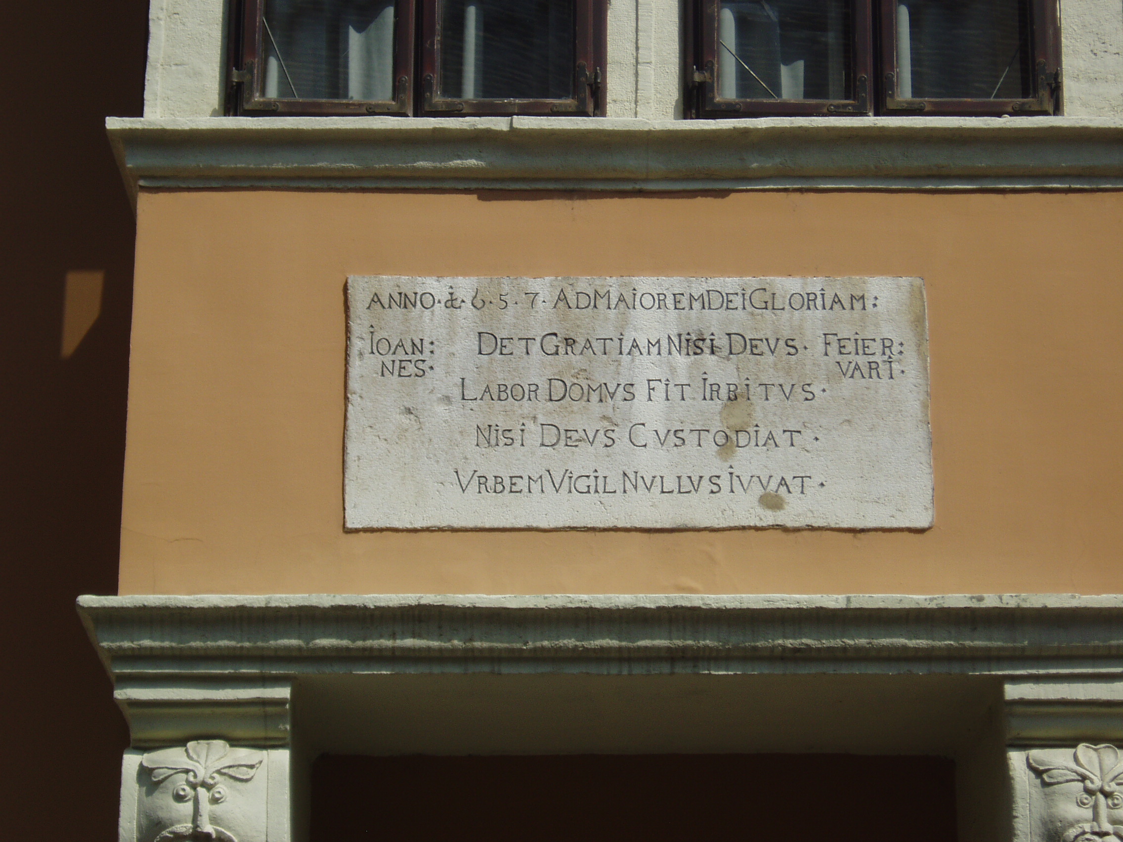 Nyilvános 1095 | 1627 | Győr, Apáca utca 9. Fejérvári-ház | Győr egyik legpatinásabb épületét 1657-ben emelték, amint a homlokzatán elhelyezett latin nyelvű emléktáblán is olvasható, majd 1770 körül átalakították. A későreneszánsz-korabarokk ház kapujának zárókövén a Fejérvári család címere, egy csőrében patkót tartó vadliba látható. Első emeleti zárt erkélye maszkban végződő csigavonalas konzolokon nyugszik. A felvétel 2008 május végén készült. Felh. irod.: Cziglényi László: Győr. Bp. Panoráma, 1981 |