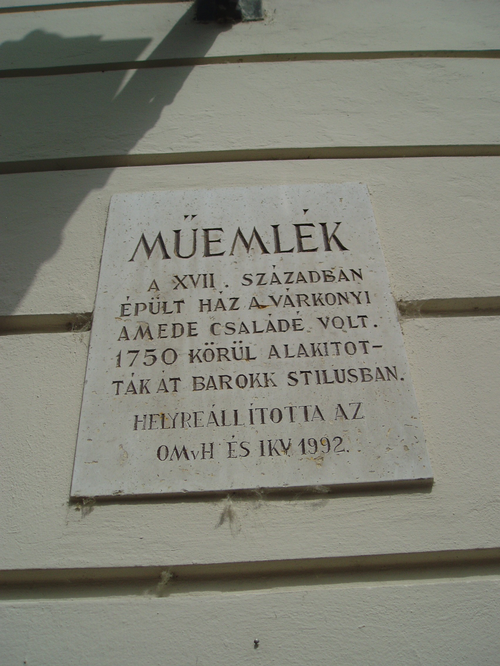 Nyilvános 1096 | 1563 | Győr, Bécsi kapu tér 4. | Európa legszebb barokk terei egyike a győri Bécsi kapu tér, amely nevét az 1860-ban lebontott nagytömegű, olaszos stílusú városkapuról kapta. A 4. számú épület a XVII. században épült, a rajta lévő műemléki tábla szerint a várkonyi Amede családé volt. Egy másik emléktábla arról tudósítja a sétálót, hogy ebben a házban élte át a város 1945-ös ostromát Borsos Miklós (1906-1990) szobrászművész, aki 1922 és 1947 között Győrben élt és alkotott (lásd még: Győr, Apor Vilmos püspök tere 2.). A felvétel 2008 május végén készült. Felh. irod.: Cziglényi László: Győr. Bp. Panoráma, 1981 |