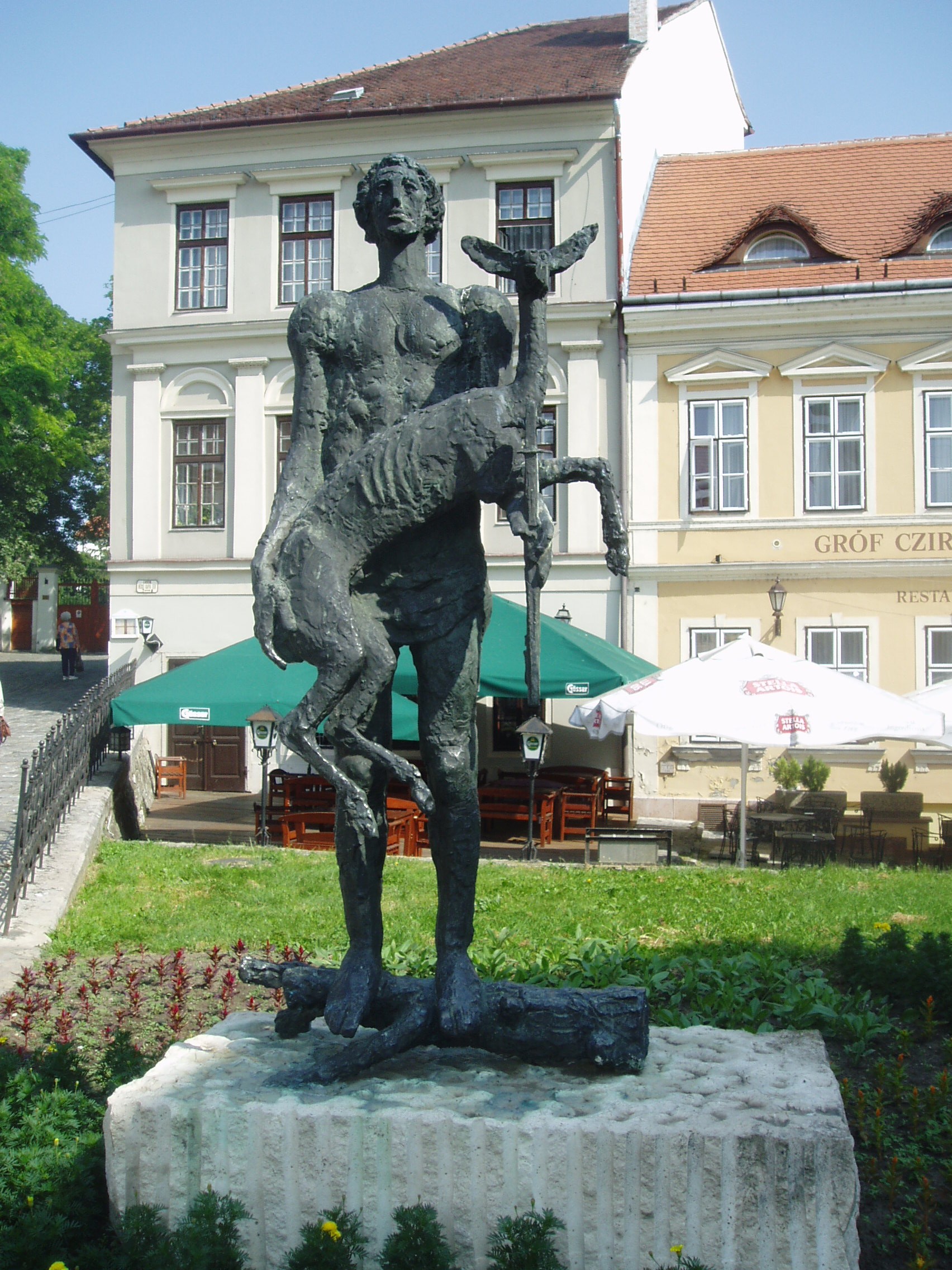 Nyilvános 1104 | 1942 | Győr, Bécsi kapu tér 6. előtt | Somogyi József: Nimród című szobrát 1983-ban állították fel. Címe akkor Vadmentés volt, s az 1954-es árvíz utáni ásványrárói vadmentés emlékére készítette (a művész Ásványrárón töltötte gyermekkorát). A felvétel 2008 május végén készült. Felh. irod.: http://nofre-retro.blogspot.com/2010/03/somogyi-jozsef-szobrasz-vadmentes-cimu.html |