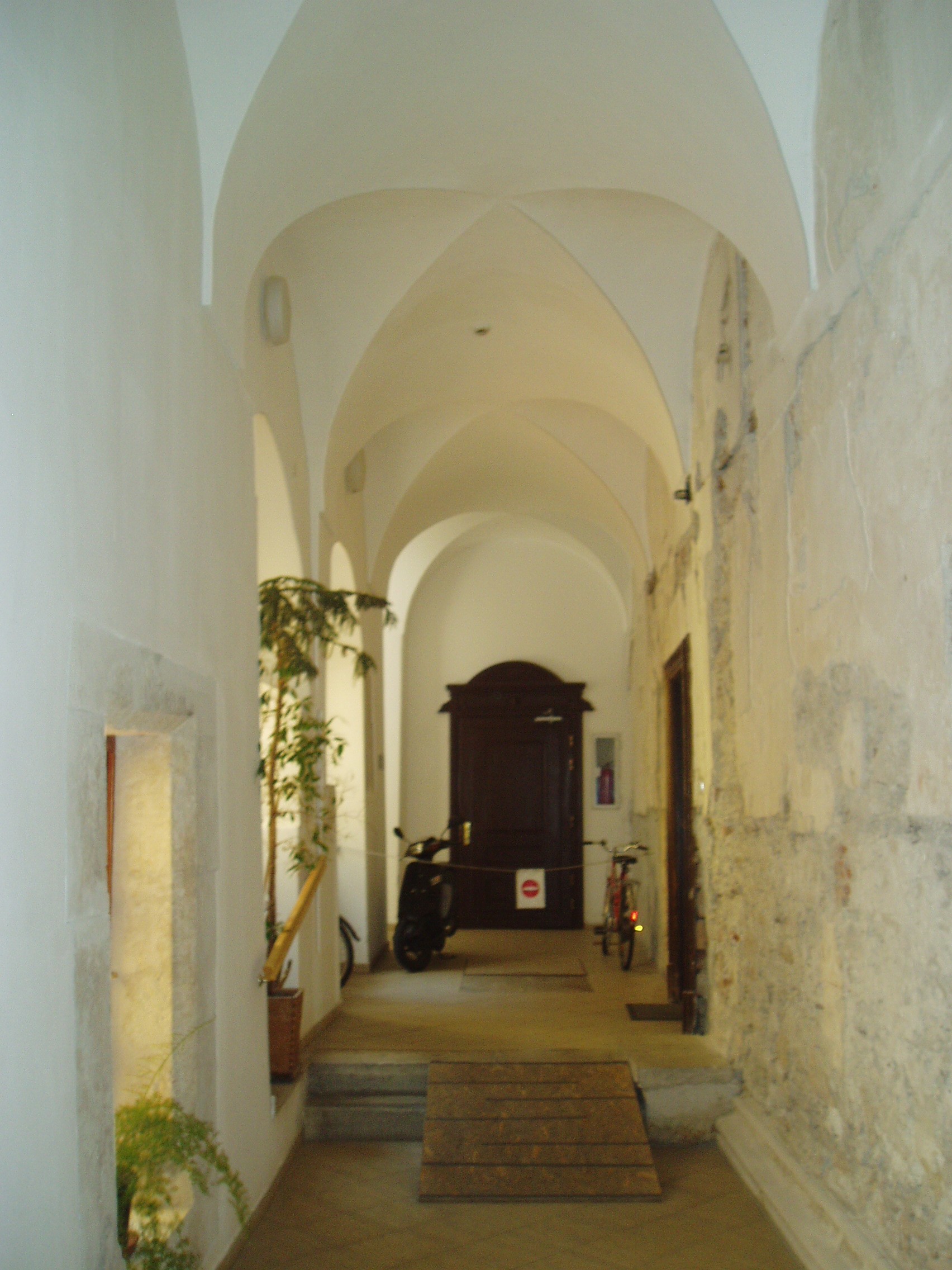 Nyilvános 957 | 1308 | Sopron, Templom utca 1. | A Templom utca bal oldalán a Kecske–templomhoz (lásd: Sopron, Fő tér) kapcsolódik az egykori bencés rendház két udvart körülfogó, kétemeletes, nagytömegű, de igénytelen külsejű épülete. A templommal együtt a ferencesek számára épült, majd 1802-ben a bencések kapták meg. E hajdani kolostor tartozéka a látogatók számára a templomból megközelíthető Káptalan–terem, Sopron város egyik legszebb gótikus műemléke (lásd: Sopron, Fő tér. Kecske-templom, Káptalan terem). A képen a rendház folyosója látható. A kép 2008 júniusában készült. Felh. irod.: Czellár Katalin: Sopron. 3. jav. kiad. Bp. Panoráma, 2000 |