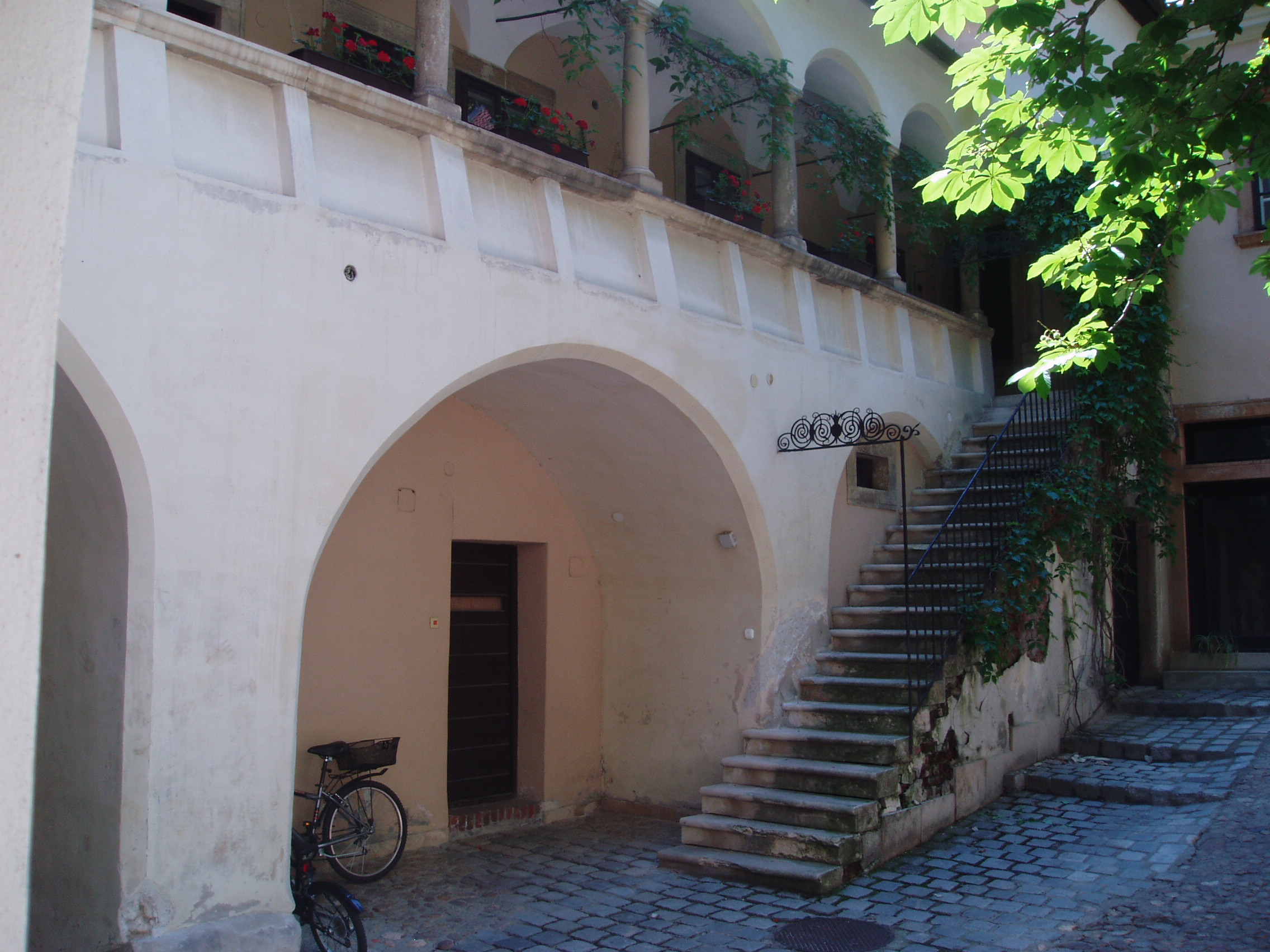 Nyilvános 959 | 1551 | Sopron, Templom utca 12. | Az eredetileg egyemeletes középkori lakóházra a XVII. századi késő reneszánsz, kora barokk átépítése során került a bejárati kapu felett félkörívesen kidomborodó zárt erkély, és ebből az időből kelteződik az udvari front kialakítása is. 1770 körül építették rá a második emeletet, amikor a Lassberg grófi család birtokába került. Az első emeleti nagyteremben ekkor városszerte híres bálokat rendeztek. 1866-ban vette meg az evangélikus konvent az épületet paplak céljaira, és azóta is az evangélikus egyház tulajdona. Dongaboltozatos, hosszú kapubejárójában a két oldalt kőráccsal díszített gótikus ülőfülkesor 1400 körül készült. A középkori eredetű épület 1866-ban került az evangélikus egyház tulajdonába, előbb paplakként hasznosították, majd ez lett Evangélikus Országos Múzeum soproni kiállítóhelye. A kép 2008 júniusában készült. Felh. irod.: Czellár Katalin: Sopron. 3. jav. kiad. Bp. Panoráma, 2000 |