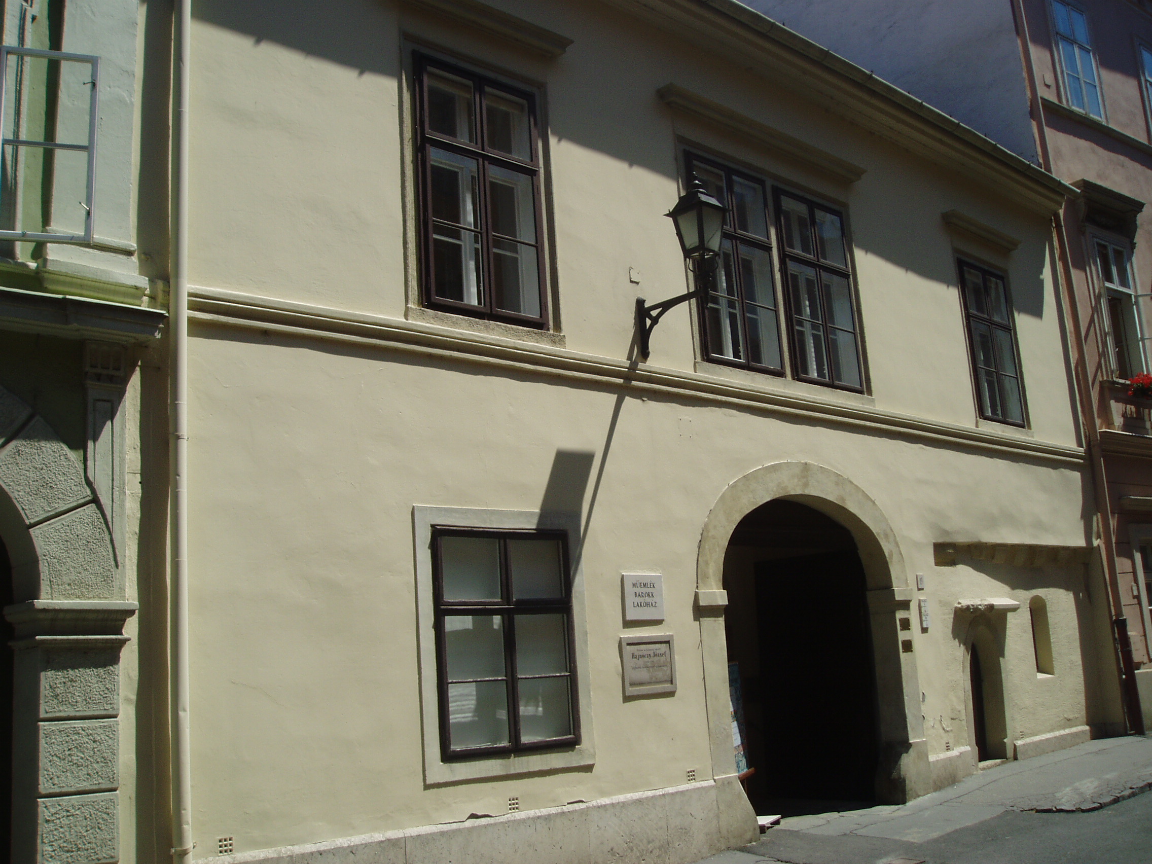 Nyilvános 952 | 1207 | Sopron, Templom utca 19. | Középkori eredetű, egyszerű, egyemeletes lakóház. 1734-ben Hajnóczy Dániel, a neves tanár és hitszónok tulajdona volt. Az épületen emléktábla hirdeti, hogy ebben a házban lakott Hajnóczy József (1750-1795) jogtudós, felvilágosult gondolkodó, aki részt vett a Martinovics-féle összeesküvésben, amiért Budán lefejezték. A kép 2008 júniusában készült. Felh. irod.: Czellár Katalin: Sopron. 3. jav. kiad. Bp. Panoráma, 2000 |