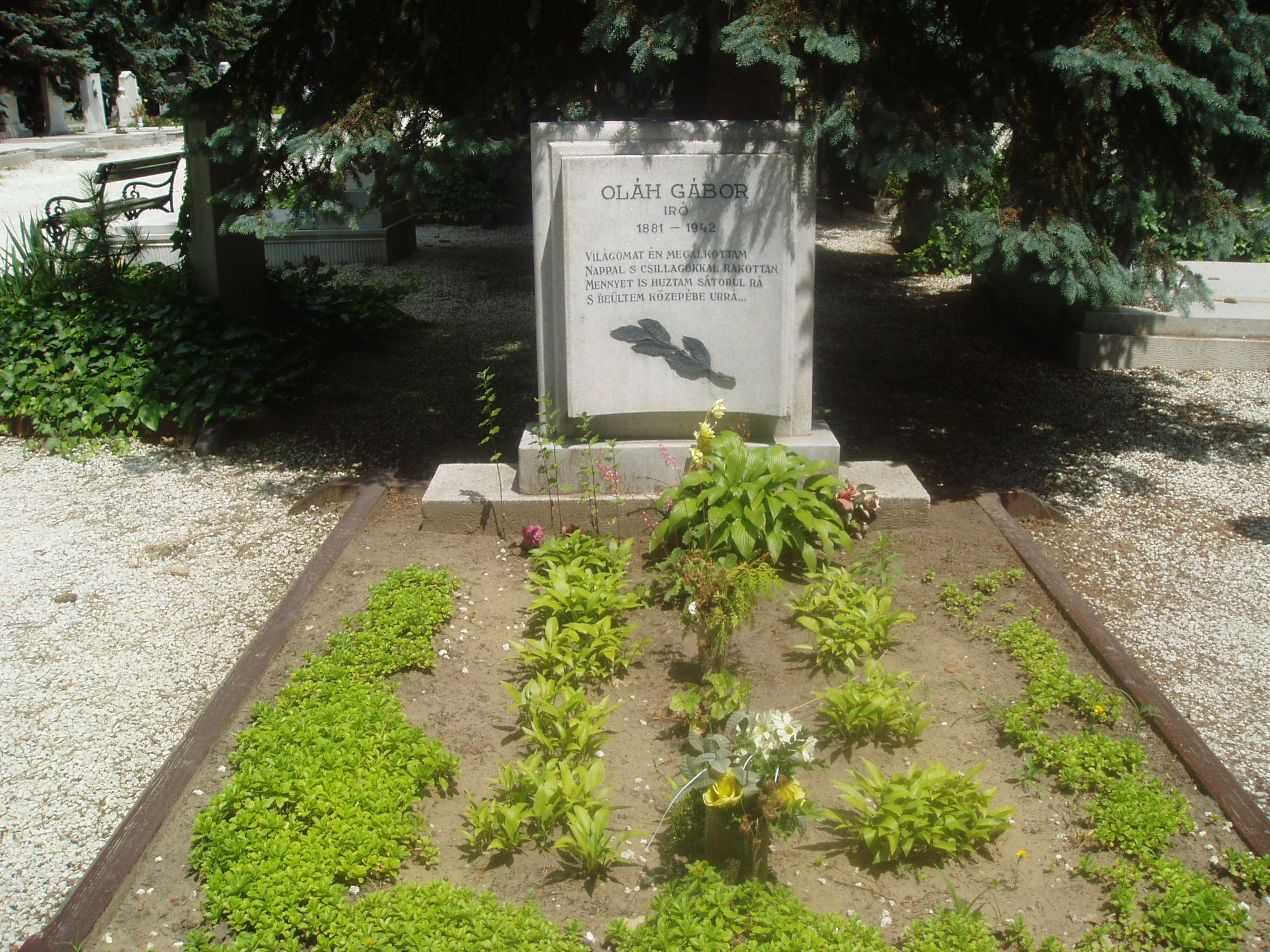 Nyilvános 1360 | 3026 | Debrecen, Bocskai út, Köztemető: Oláh Gábor sírja | Debrecen új köztemetőjét 1932-36 között alakították ki. A temetőkertet és a nagy művészettörténeti értéket képviselő ravatalozó épületét Borsos József tervezte. A díszsírhelyek a főbejárattól jobbra helyezkednek el. Itt nyugszik a magyar művelődéstörténet számos nagy alakja, akiknek földi maradványait áthozták a többnyire felszámolt régi temetőkből. Itt van Oláh Gábor (Debrecen, 1881. jan. 17. – Debrecen, 1942. jún. 23.): író, költő, újságíró, tanár sírja. A fénykép 2006 júniusában készült. Felh. irod.: Kovács Gergelyné: Debrecen. Bp. Panoráma, 1981 |