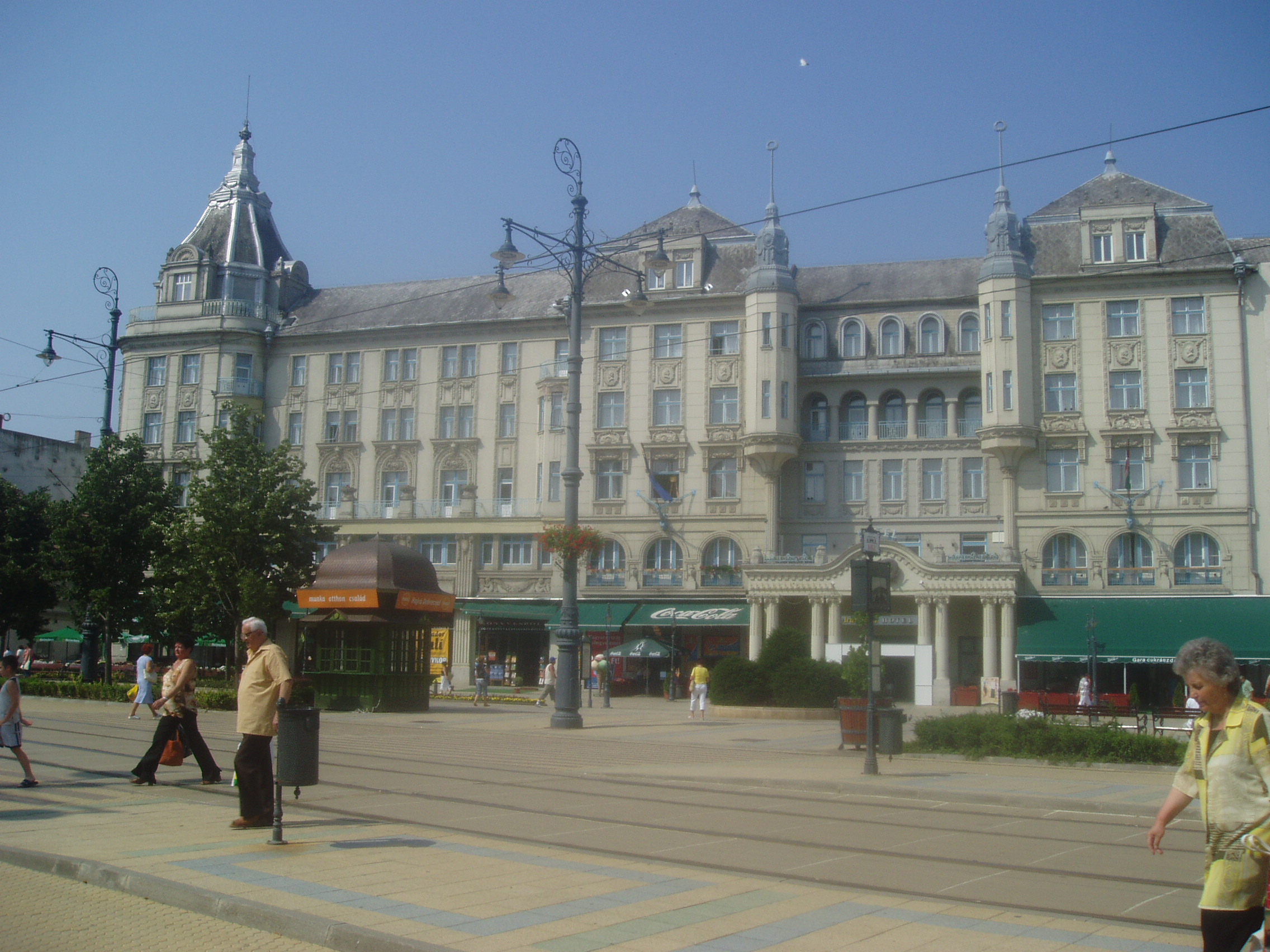 Nyilvános 1110 | 1751 | Debrecen, Piac utca 11-15. Arany Bika Szálloda | A szecessziós épületegyüttes 1913–1915 között épült Hajós Alfréd és Villányi Lajos tervei szerint. Új szárnyát 1976-ban építették hozzá. A négyemeletes főépület homlokzatán olasz kőfaragók által készített szecessziós plasztikák láthatók. A szálloda előterének két oldalát Józsa János színes üvegablakai díszítik. A régi és új szárnyat összekötő hallban egy rokokó pár életnagyságú szobra mellett vezet fel a lépcsősor az egykori díszteremhez. A ma Bartók Béláról elnevezett terem Debrecen 1500 férőhelyes, legnagyobb előadóterme. A tükörteremben Benyovszky István és Veres Géza festményei régi debreceni és hortobágyi életképeket idéznek fel. A mai Aranybika szálló helyén már a XVI. század végén vendégfogadó állt. 1699-ben árverezték el Bika András debreceni polgár egykor itt állott családi házát (a szálloda róla kapta a nevét), s benne négy vendégszobát rendeztek be. A hamarosan szűknek bizonyult, s a Rákóczi–szabadságharc idején erősen meg is rongálódott régi épületre 1799-ben emeletet húztak, majd 1809-ben ismét átépítették. Ekkor készült el vasból vert, bikát ábrázoló cégére, amely 1878-ig hirdette a közönségnek a szálló létét. 1840 körül a földszinten kávéházat nyitotak. 1848-ban egy időre Nádor szállóra keresztelték, s felsőbb parancsra a Bach–korszakban is így hívták. Az öreg épületben számos nevezetes vendég lakott, többek között Széchenyi István, Vörösmarty Mihály, Wesselényi Miklós, Deák Ferenc, Petőfi, Bem tábornok. Nagy Sándor és vezérkara 1849. augusztus 2-án innét indult a csatatérre, ahol a maroknyi magyar sereg nem tudott ellenállni a többszörös túlerőnek. Így estére már Paszkievics herceg és vezérkara ütütt a Bikában tábort s ünnepelték a diadalt, míg Debrecen lakói bezárt házakban, lefüggönyzött ablakok mögött siratták az elveszett reményeket. A XIX. század végére már nemzetközi viszonylatban is jól ismert, patinás szálló kicsinek bizonyult, ezért Steindl Imre tervei szerint pompás új épületet emeltek. A szállodával egyidejűleg kávéháza is megnyílt, első vendége Jókai Mór volt. Az új, egyemeletes szállodaépület pezsgő központja lett Debrecen szellemi és társasági életének. A debreceni írók és művészek, valamint a fővárosból idelátogató barátaik gyakran találkoztak a „közvélemény–asztalnak” nevezett irodalmi törzsasztalnál. 1913-ban elkezdték ennek az épületnek a lebontását is, s a szálló mostani épülete 1915-re lett készen. Az 1920-as években gyakori vendége volt a Bikának Móricz Zsigmond (szobáját születésének évfordulóján emléktáblával jelölték meg) és tizenöt éven át lakott benne Oláh Gábor költő. 1944/45 telén a szálloda adott otthont az Ideiglenes Nemzetgyűlés, majd az Ideiglenes Kormány tagjainak. Felh. irod.: Papp Antal: Debrecen. Bp. Panoráma, 1976 Kovács Gergelyné: Debrecen. Bp. Panoráma, 1981 300 év históriája: egy polgárváros az Aranybikában. Debrecen, Pro Millennium, 1999 |