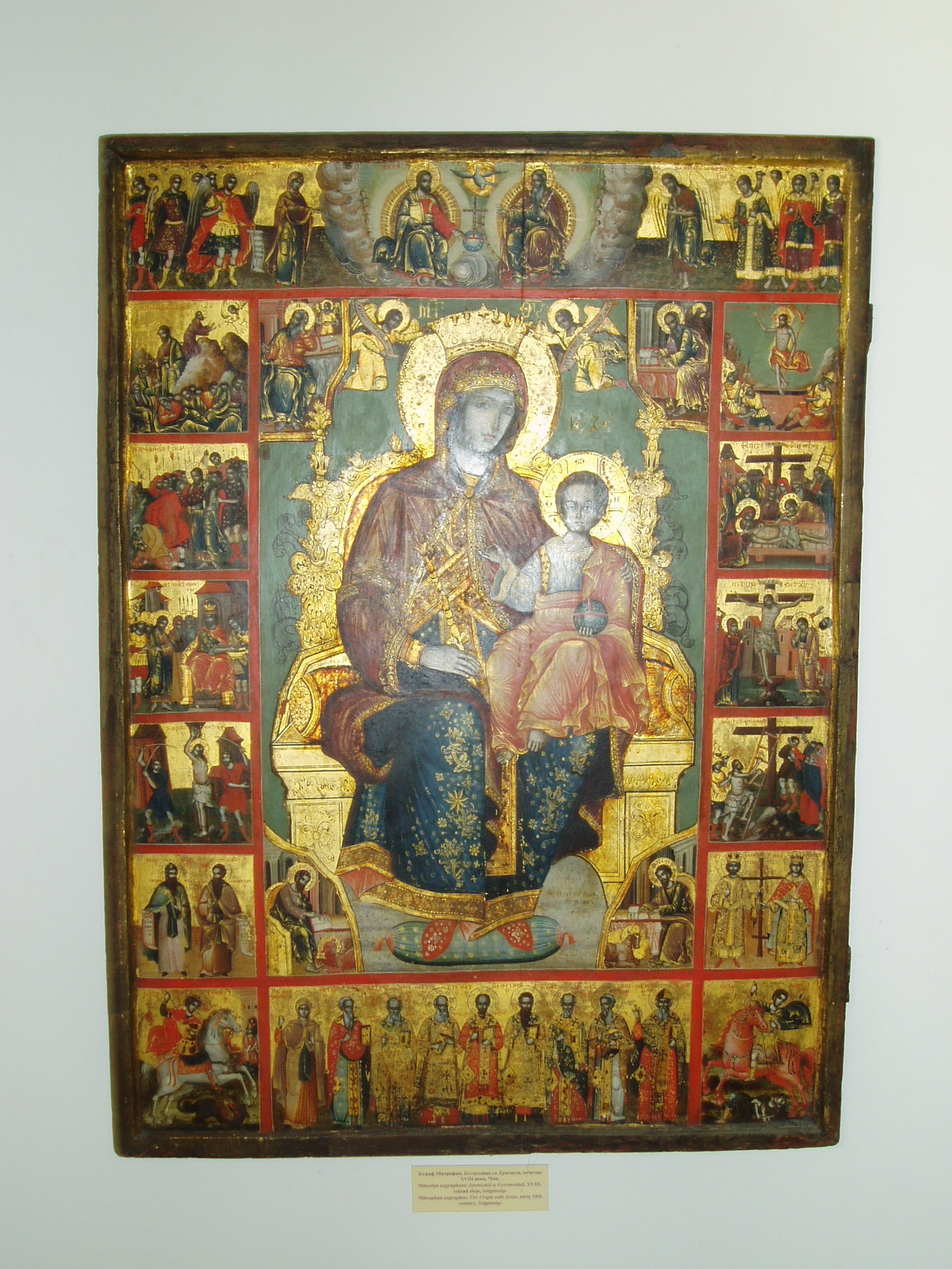Nyilvános 1149 | 2477 | Szentendre, Pátriárka utca 5. Szerb Egyházművészeti Gyűjtemény | A Beográda-templom - a görögkeleti (ortodox) püspöki székesegyház - kertjében áll a püspöki palota és a szerb egyházművészeti múzeum épülete. Magyarország művészeti emlékeinek egyedülálló színfoltja a XVI.-XIX. századi szerb egyházművészeti emlékeket, ikonokat, ötvösmunkákat és más iparművészeti alkotásokat bemutató Szerb Egyházművészeti Gyűjtemény. A múzeum törzsanyaga a Budai Szerb Ortodox Püspökség kincstárából és a hazai szerb templomokból Szentendrére került kiemelkedő jelentőségű műtárgyakból alakult ki. A közelmúltban felújított épületbe került a Budai Szerb Püspökség könyvtára és levéltára is, mely szerb ősnyomtatványokat és egy török nyelvű kiváltságlevelet is tartalmaz. A képen a görög Mitrofan és társa: Isten anyja a gyermekkel és a szenvedéstörténet eseményeivel című, a XVIII. század elejéről származó ikonja látható, amely eredetileg a szigetcsépi templomé volt. A fénykép 2005 szeptemberében készült. Felh. irod.: www.szentendre.hu |