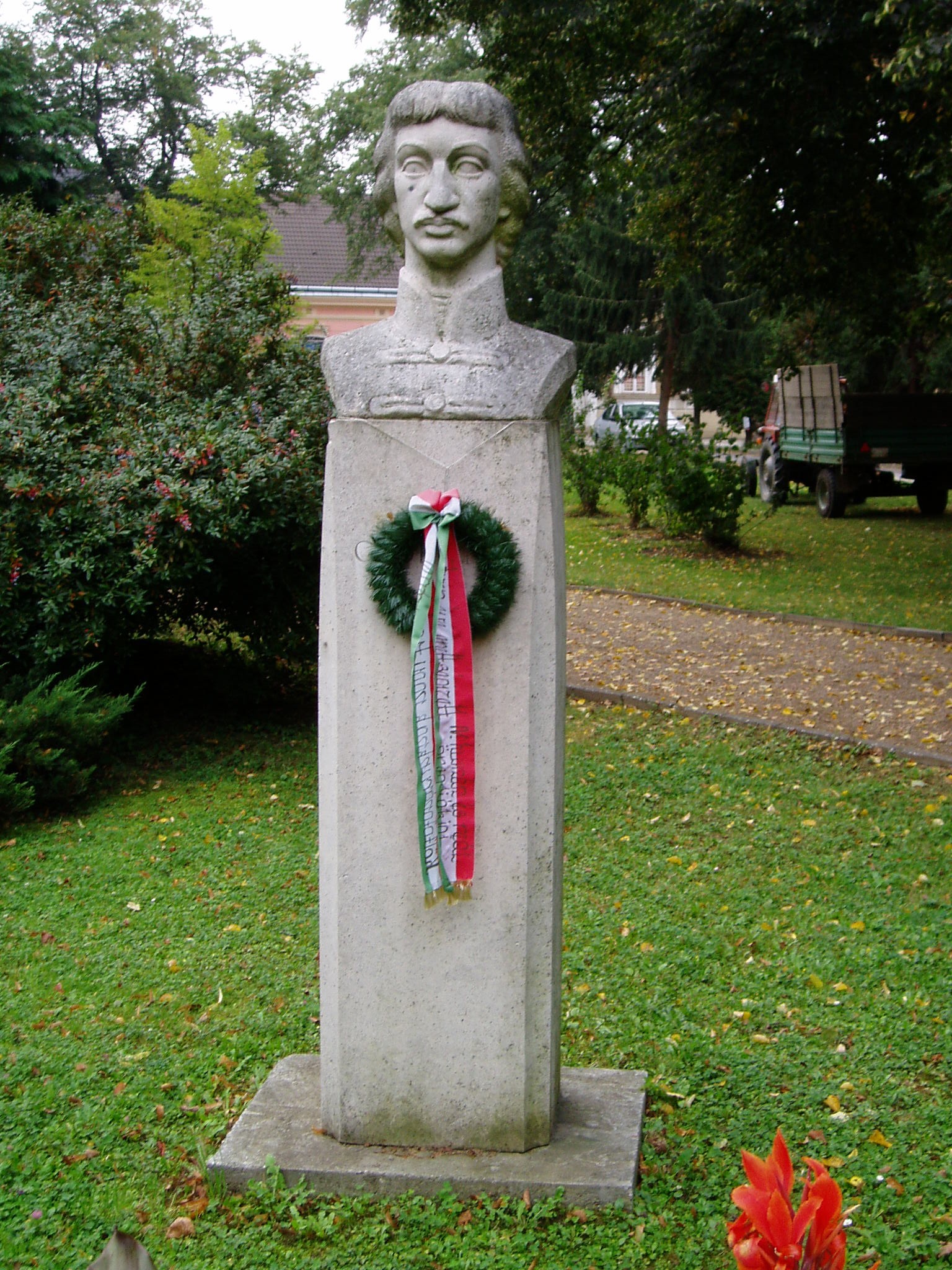 Nyilvános 1159 | 2440 | Csurgó, Széchenyi tér: Csokonai mellszobra | Csokonai Vitéz Mihály 1799/1800-ban helyettesítő tanárként tanított a nem sokkal korábban alapított csurgói gimnáziumban (lásd: Csurgó, Csokonai u. 24.). Modern mellszobra Kamocsay István alkotása. A fénykép 2004 októberében készült. Felh. irod.: Csurgói kalauz. Szerk. Terényi Zoltán. 1974 |
