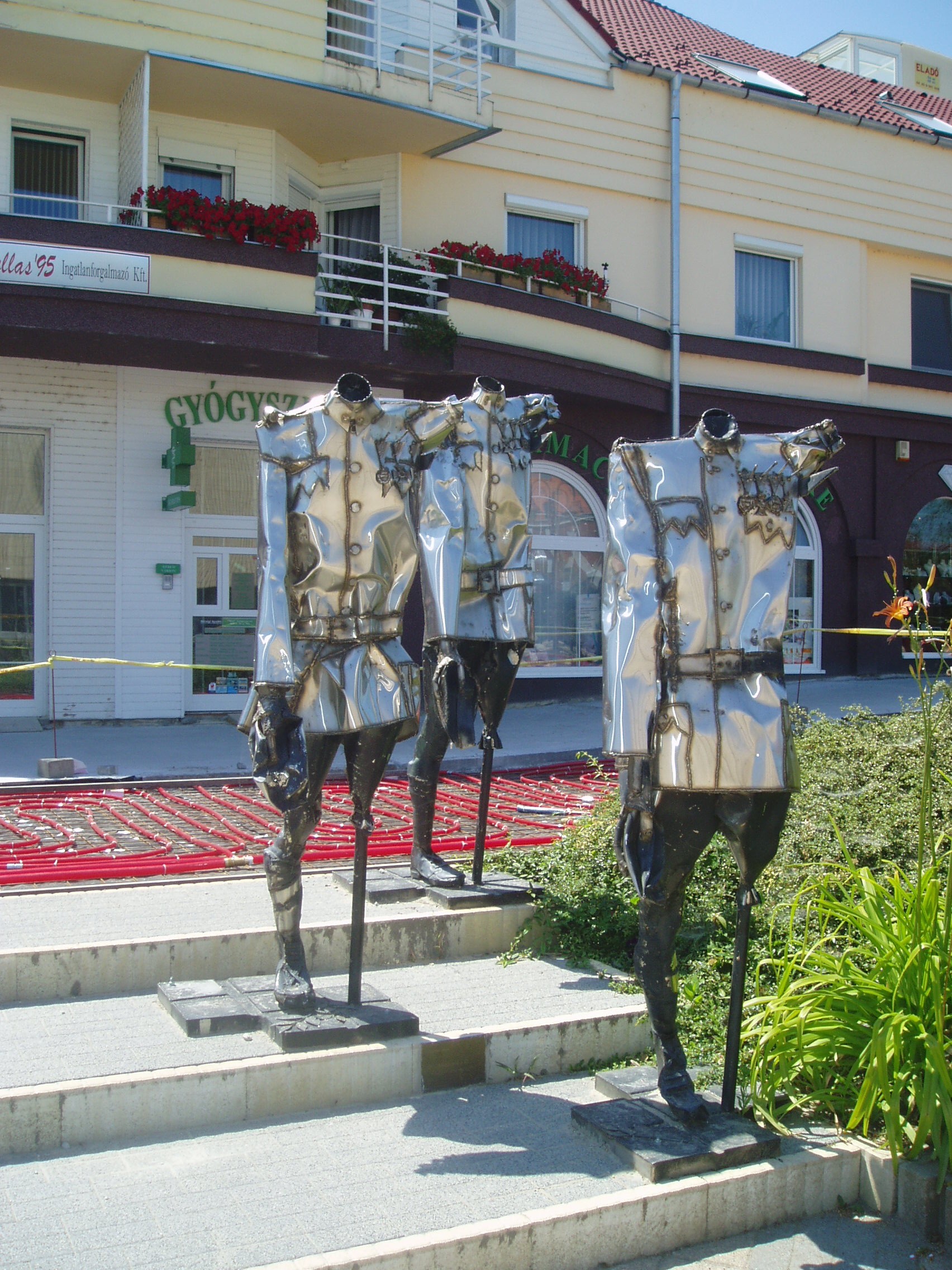 Nyilvános 1110 | 2374 | Siófok, Fő tér: Varga Imre: Mementó a II. Magyar Hadseregért | Varga Imre szobrászművész 1923. november 1-jén született Siófokon. Már gyermekkorában - a siófoki elemi iskolában - rendkívül jó rajzkészségével tűnt ki. 13 évesen szerepelt egy képével Párizsban. A képzőművészet terén elért kimagasló érdemeiért, amellyel Magyarország és Siófok város hírnevét is öregbítette, 1985-ben ő lett Siófok város első díszpolgára. Hazai és külföldi tereken, templomokban, középületekben mintegy 300 alkotását helyezték el. Szobrai állnak Belgiumban, Franciaországban, Lengyelországban, Németországban, Norvégiában és Izraelben. Siófokon a Fő téren szabadtéri szoborkiállítása látható. A képen Mementó a II. Magyar Hadseregért című megrendítő szoborkompozíciója látható. A fénykép 2006 júliusában készült. Felh. irod.: http://www.siofok.com/uj/object/varga-hu.html |