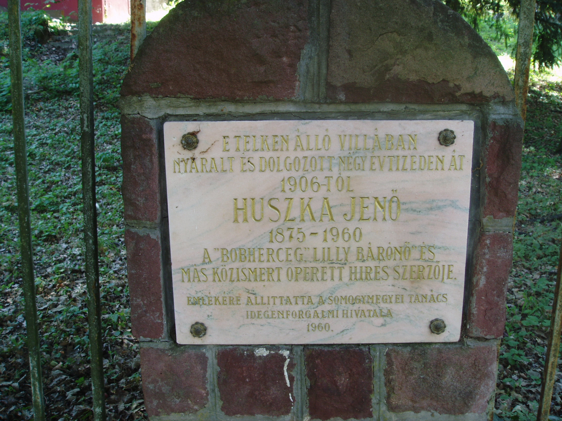 Nyilvános 1010 | 1685 | Fonyód, Bartók utca 42. Huszka Jenő villája | A fonyódi magasparton húzódó villasor közepén találjuk Huszka Jenő egykori villáját, ahol csaknem négy évtizeden keresztül, 1907 és 1944 között pihent és alkotott. Huszka először az ettől a villától balra lévő ún. Náray–Szabó–villát vásárolta meg, majd 1906-ban elvette feleségül a mostani Huszka–villa akkori tulajdonosának, Lippich Eleknek a lányát, Leonát. Amikor a házaspár 1924-ben elvált, a zeneszerző megvásárolta a villát, így továbbra is itt töltötte a nyarakat második feleségével, Arányi Mária írónővel. Huszka ebben a villában írta a Lili bárónő több dalát, s itt komponálta a Mária főhadnagy csaknem teljes zenei anyagát. A villában használt íróasztala ma a közeli múzeum állandó kiállításán megtekinthető (lásd: Fonyód, Bartók u. 3.) Sajnos, a villa kerítésén 1960-ban elhelyezett emléktábla szövege meglehetősen pontatlan. A fénykép 2007 júliusában készült. Felh. irod.: Arányi Mária: Szellő szárnyán... Huszka Jenő életének regénye. Bp. Zeneműkiadó, 1977 htp://konyvtar.fonyod.hu/fek.htm |