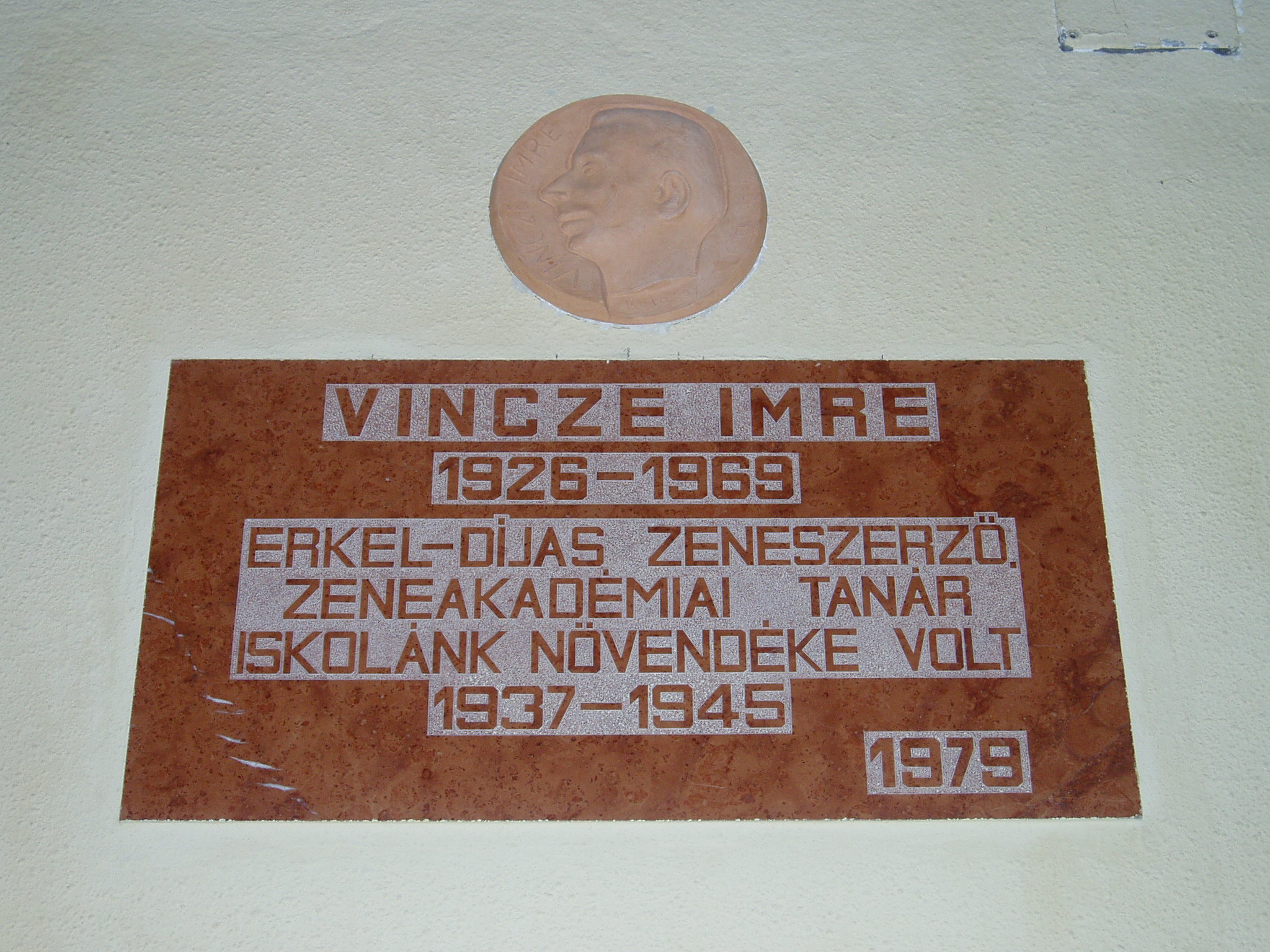 Nyilvános 1406 | 2935 | Tata, Tanoda tér 5. Eötvös József Gimnázium: Vincze Imre emléktáblája | A tatai gimnáziumot 1765-ben gróf Esterházy Miklós alapította, s vezetésére a piarista tanítórendet kérte fel. Az iskola kezdetben a közeli majki kamalduli szerzetesek többször is átalakított gazdasági épületeiben működött. A jelenlegi iskolaépületet a XX. század elején emelték, 1912-ben kezdődött meg benne a tanítás. Az első emeleti folyosó falán neves egykori tanárok és diákok emléktábláit helyezték el. Vincze Imre (1926-1969) zeneszerző 1937-1945 között volt az iskola diákja. A fénykép 2005. júliusában készült. Felh. irod.: www.eotvos-tata.sulinet.hu Wehner Tibor: Tatai szobrok, emlékművek, emléktáblák. Tata, 1980 |