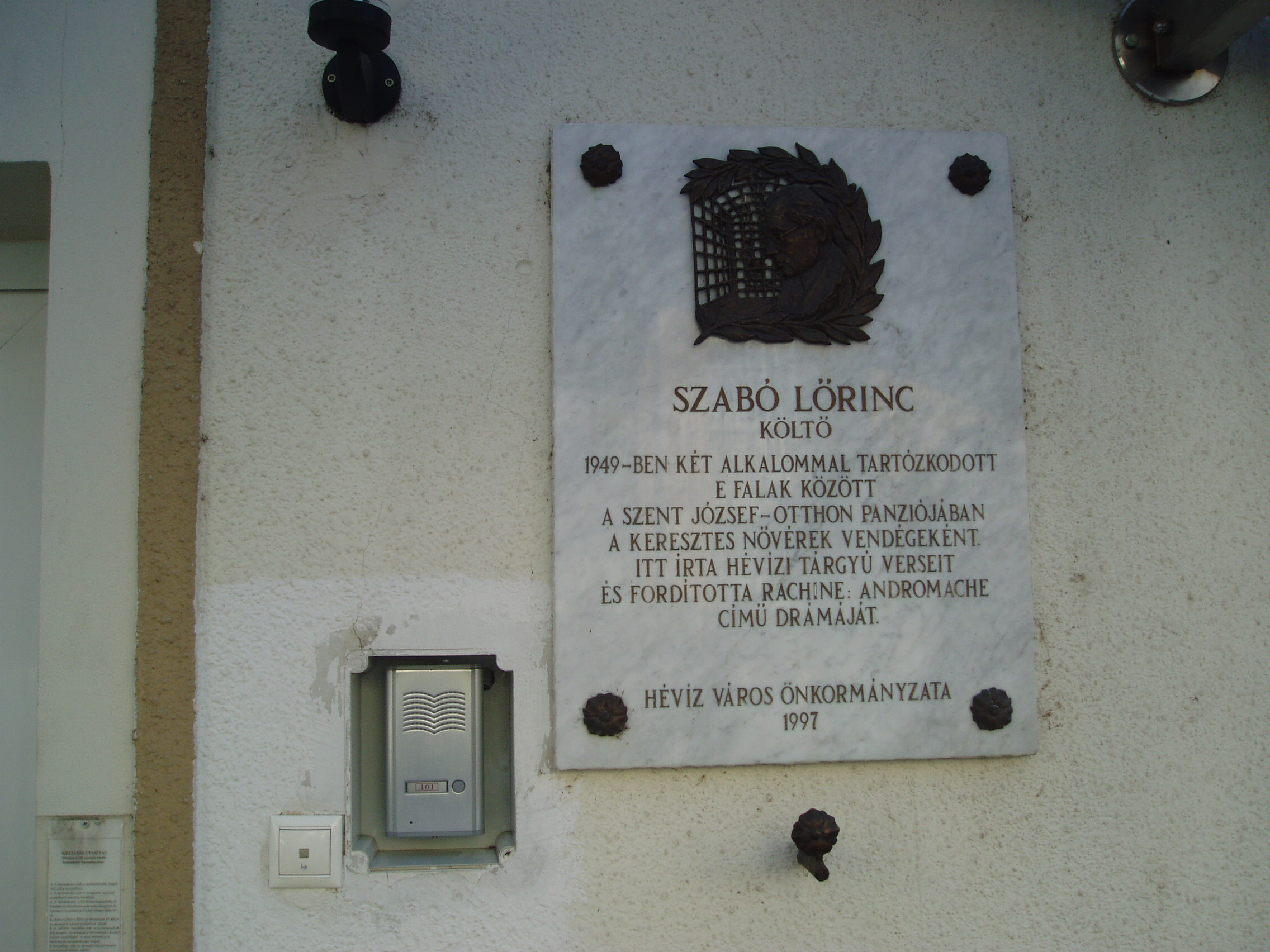 Nyilvános 1274 | 2546 | Hévíz, Erzsébet királyné utca 5. | Mint az épület homlokzatán elhelyezett emléktáblán is olvasható, Szabó Lőrinc 1949-ben két alkalommal tartózkodott e falak között. Több verse született ebben a házban, amely akkor a Szent József-Otthon panziója volt, s svájci eredetű apácarend tagjai, ún. keresztes nővérek vezették. Egyik itt írt verse, amely a Kádfürdő címet viseli, az itteni víz gyógyító hatásáról szól, kedélyes archaizálással: A kádi víz nem tündér szerető, cirógat bár, jóféle ápoló csak; hát még a kenet, mit kintről a tónak fő-titkú (s még szerintem se merő pokolsárkány-ganéjból eredő) sarából tsúzra száz éve pakolgat s delejsugárnak-minek mond maholnap a tudományos, modern feredő! E víz, mondom, nem tündér, nem bohó; vén csap okádja, véneknek való. Tüstént jelzik gyöngyzúzos szőreink, jővén, sava dicséretes fokát, s ha mégy, már szívből szólsz rá vissza, mint ténsúr Berzsenyi tette, hogy: Vivát! A felvétel 2006 októberében készült. Felh. irod.: Horányi Károly: Szabó Lőrinc utazása. = www.kortarsonline.hu/0607/horanyi.htm |