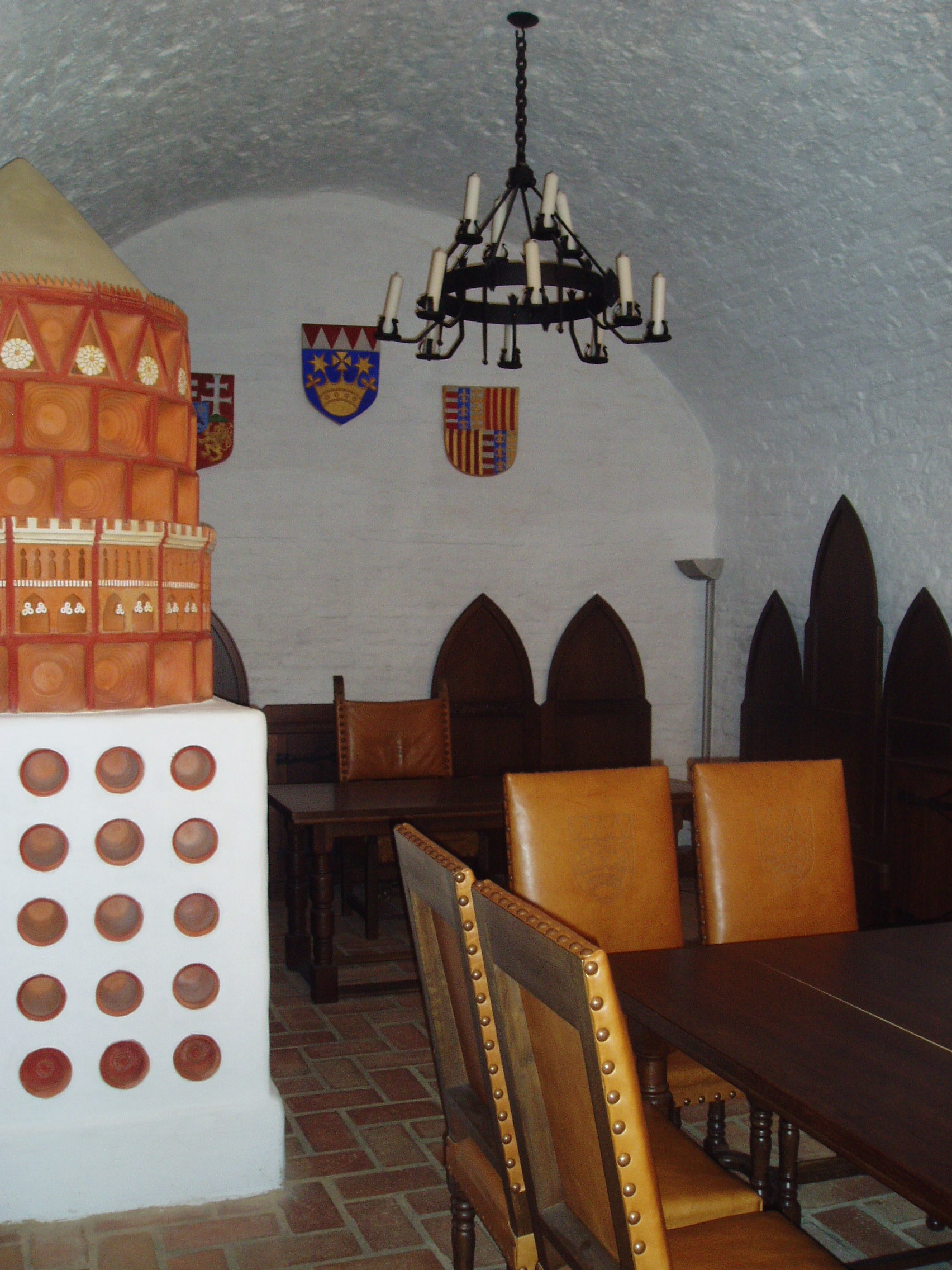 Nyilvános 966 | 1508 | Gyula, Vár | A vár belső termeiben a közelmúltban nyílt meg a Vármúzeum. Berendezett termei és kápolnája igazi korabeli hangulatot nyújtanak a látogatóknak. A képen az emeleten található lovagterem részlete látható egy XVI. századi kályha rekonstrukciójával. A fénykép 2007 júliusában készült. |