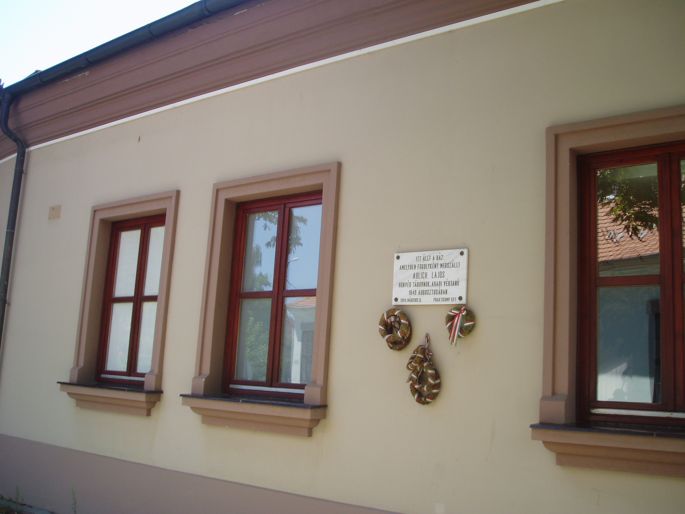 Nyilvános 1013 | 1485 | Gyula, Városház utca 23. | A lakóházat 1994-ben eredeti formájában építették újjá. 1849 augusztusában itt szállt meg Aulich Lajos honvéd tábornok. A szabadságharc tragikus gyulai eseményét lásd: Gyula, Várkert: Honvédtiszti emlékhely. A fénykép 2007 júliusában készült. Felh. irod.: Czeglédi Imre: Gyula útikalauz. 2. jav., bőv. kiad. Gyula, 1995 |