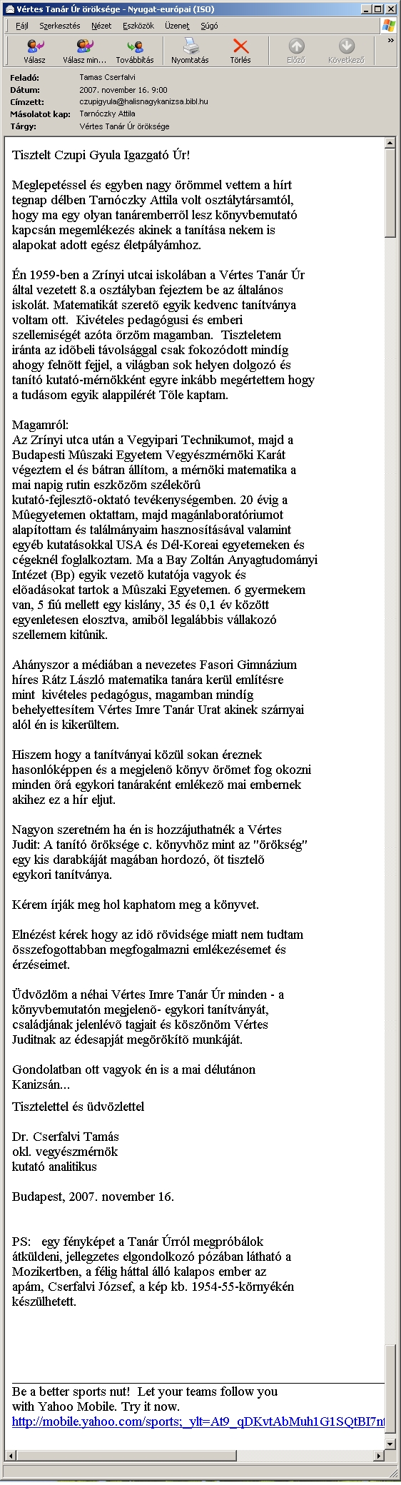 Nyilvános 1230 | 2453 | Cserfalvi tamás levele Vértes Imre estéjére | Tisztelt Czupi Gyula Igazgató Úr! Meglepetéssel és egyben nagy örömmel vettem a hírt tegnap délben Tarnóczky Attila volt osztálytársamtól, hogy ma egy olyan tanáremberről lesz könyvbemutató kapcsán megemlékezés akinek a tanítása nekem is alapokat adott egész életpályámhoz. Én 1959-ben a Zrínyi utcai iskolában a Vértes Tanár Úr által vezetett 8.a osztályban fejeztem be az általános iskolát. Matematikát szerető egyik kedvenc tanítványa voltam ott. Kivételes pedagógusi és emberi szellemiségét azóta őrzöm magamban. Tiszteletem iránta az időbeli távolsággal csak fokozódott mindíg ahogy felnőtt fejjel, a világban sok helyen dolgozó és tanító kutató-mérnökként egyre inkább megértettem hogy a tudásom egyik alappilérét Tőle kaptam. Magamról: Az Zrínyi utca után a Vegyipari Technikumot, majd a Budapesti Műszaki Egyetem Vegyészmérnöki Karát végeztem el és bátran állítom, a mérnöki matematika a mai napig rutin eszközöm szélekörű kutató-fejlesztő-oktató tevékenységemben. 20 évig a Műegyetemen oktattam, majd magánlaboratóriumot alapítottam és találmányaim hasznosításával valamint egyéb kutatásokkal USA és Dél-Koreai egyetemeken és cégeknél foglalkoztam. Ma a Bay Zoltán Anyagtudományi Intézet (Bp) egyik vezető kutatója vagyok és előadásokat tartok a Műszaki Egyetemen. 6 gyermekem van, 5 fiú mellett egy kislány, 35 és 0,1 év között egyenletesen elosztva, amiből legalábbis vállakozó szellemem kitűnik. Ahányszor a médiában a nevezetes Fasori Gimnázium híres Rátz László matematika tanára kerül említésre mint kivételes pedagógus, magamban mindíg behelyettesítem Vértes Imre Tanár Urat akinek szárnyai alól én is kikerültem. Hiszem hogy a tanítványai közül sokan éreznek hasonlóképpen és a megjelenő könyv örömet fog okozni minden őrá egykori tanáraként emlékező mai embernek akihez ez a hír eljut. Nagyon szeretném ha én is hozzájuthatnék a Vértes Judit: A tanító öröksége c. könyvhöz mint az "örökség" egy kis darabkáját magában hordozó, őt tisztelő egykori tanítványa. Kérem írják meg hol kaphatom meg a könyvet. Elnézést kérek hogy az idő rövidsége miatt nem tudtam összefogottabban megfogalmazni emlékezésemet és érzéseimet. Üdvözlöm a néhai Vértes Imre Tanár Úr minden - a könyvbemutatón megjelenő- egykori tanítványát, családjának jelenlévő tagjait és köszönöm Vértes Juditnak az édesapját megörökítő munkáját. Gondolatban ott vagyok én is a mai délutánon Kanizsán... Tisztelettel és üdvözlettel Dr. Cserfalvi Tamás okl. vegyészmérnök kutató analitikus Budapest, 2007. november 16. PS: egy fényképet a Tanár Úrról megpróbálok átküldeni, jellegzetes elgondolkozó pózában látható a Mozikertben, a félig háttal álló kalapos ember az apám, Cserfalvi József, a kép kb. 1954-55-környékén készülhetett. |