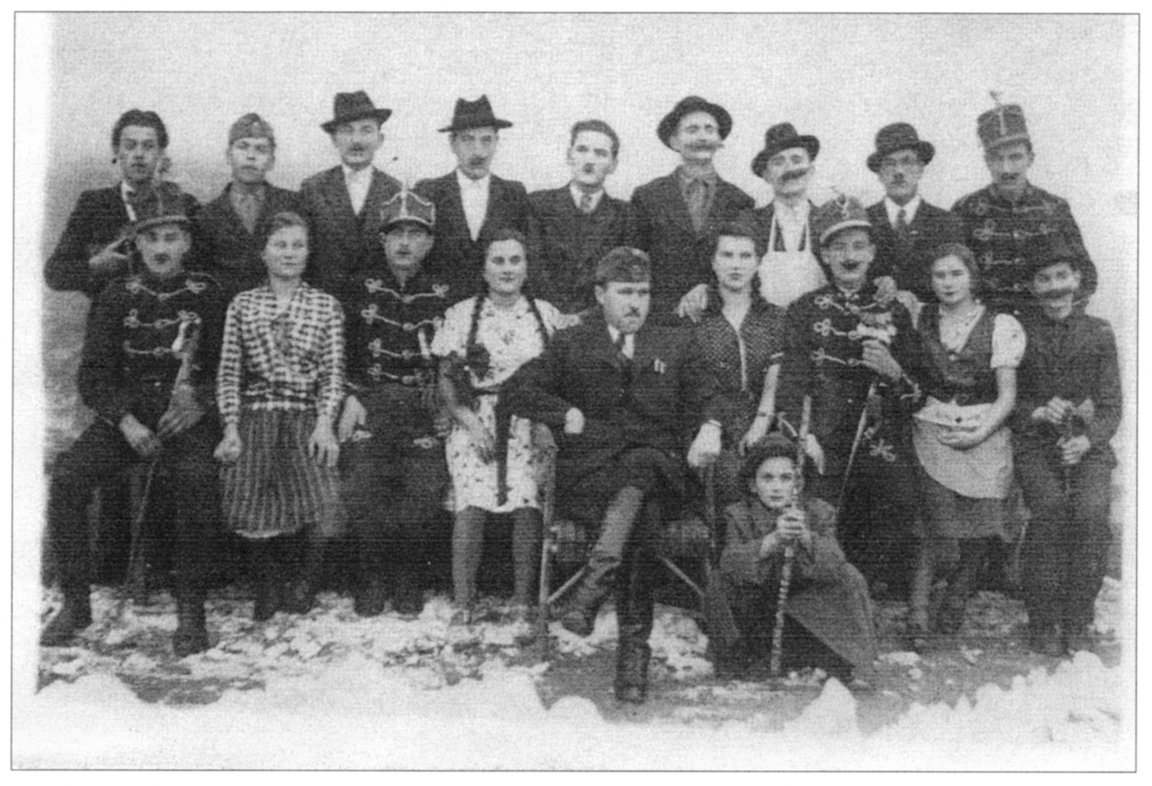Nyilvános 1826 | 5180 | "A vén bakancsos... társulata" | Felső sor, balról: Horváth Rudolf, Révész István, Fleck József, Somogyi György, Pálmai László, Varga Lajos, Vajdai Károly, Dara József Alsó sor: Skoda Ferenc, Gyergyák Margit, Pusztai László, Gyergyák Anna, Vértes Imre, Vajdai Erzsébet, Somogyi Péter, Bedi Anna (Hajnalka), Sali László |