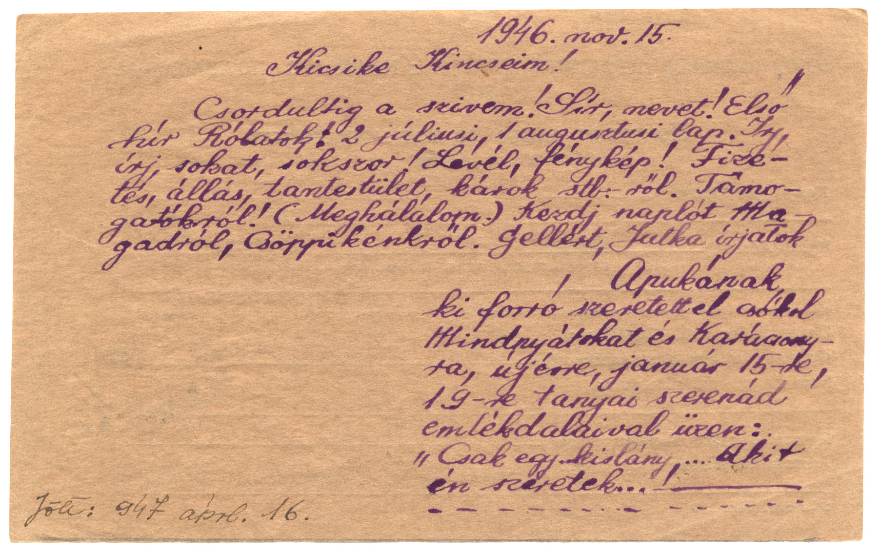 Nyilvános 1324 | 2499 | Vértes Imréné | Letenye IV. /Zala vm./ Magyarország Vértes Imre hdgy. U.R.S.S. "Moszkva" Vöröskereszt, Postafiók 430/1. c. 1946. nov. 15. Kicsike Kincseim! Csordultig a szívem! Sír, nevet! Első hír Rólatok: 2 júliusi, 1 augusztusi lap. Írj, írj sokat, sokszor! Levél, fénykép! Fizetés, állás, tantestület, káros stb.-ről. Támogatókról! (Meghálálom.) Kezdj naplót Magadról, Csöppikénkről. Gellért, Jutka írjatok Apukának ki forró szeretettel csókol Mindnyátokat és Karácsonyra, újévre, január 15-re, 19-re tanyai szerenád emlékdalaival üzen: "Csak egy kislány, ... akit én szeretek...!" Jött: 1947 áprl. 16. |