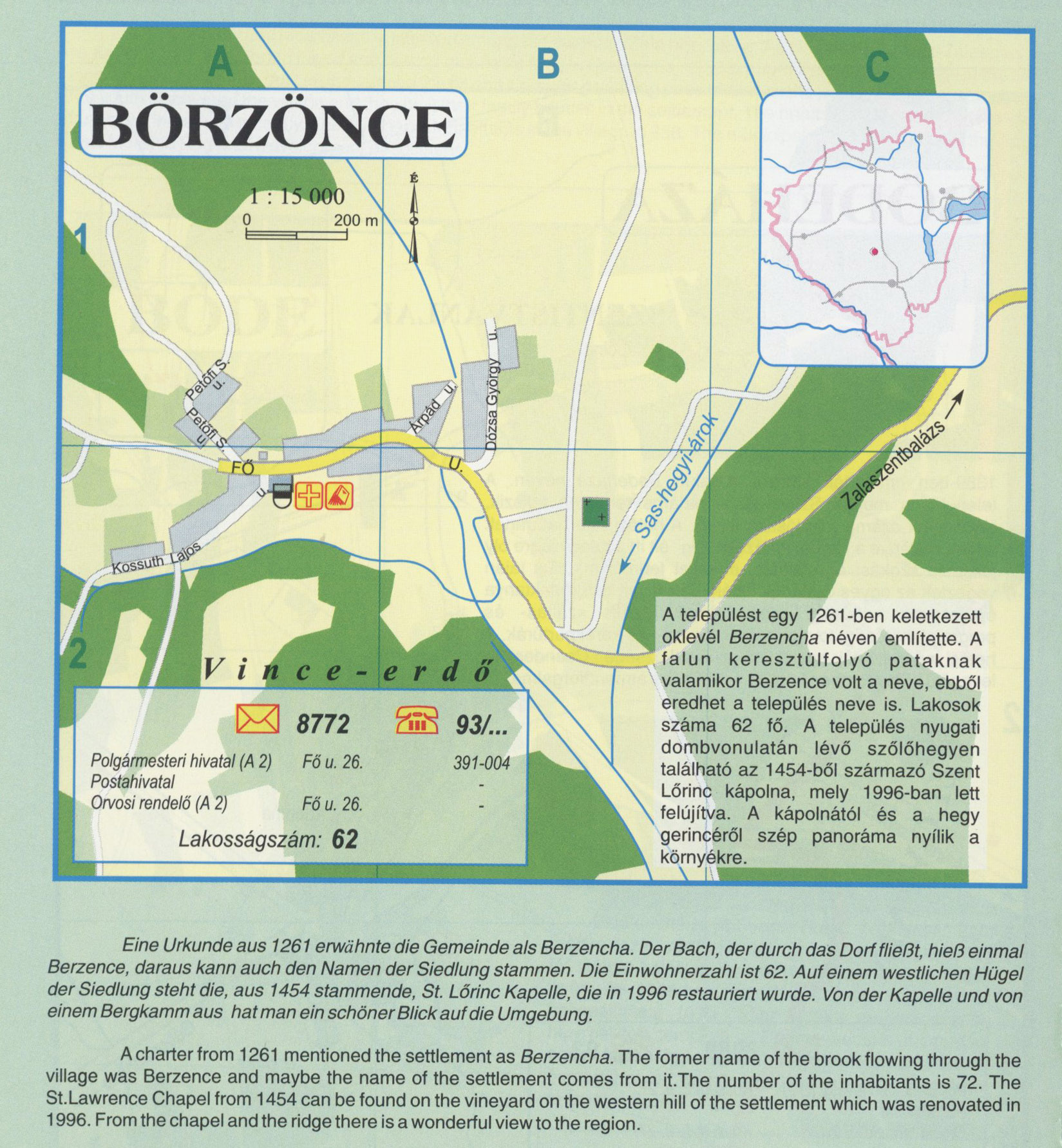 Nyilvános 2352 | 9042 | Börzönce | A települést egy 1261-ben keletkezett oklevél Berzencha néven említette. A falun keresztülfolyó pataknak valamikor Berzence volt a neve, ebből eredhet a település neve is. Lakosok száma 62 fő. A település nyugati dombvonulatán lévő szőlőhegyentalálható az 1454-ből származó SzentLőrinc kapolna, mely 1996-ban lett felújítva. A kápolnatól és a hegy gerincéről szép panoráma nyílik a környékre. Eine Urkunde aus 1261 erwdhnte die Gemeinde als Berzencha. Der Bach, der dutch das Dorf flieSt, hieR einmal Berzence, daraus kann auch den Namen der Siedlung stammen. Die Einwohnerzahl ist 62. Auf einem westlichen Hugel der Siedlung steht die, aus 1454 stammende, St. Lorinc Kapelle, die in 1996 restauriert wurde. Von der Kapelle und von einem Bergkamm aus hat man ein schonerBlickaufdie Umgebung. A charter from 1261 mentioned the settlement as Berzencha. The former name of the brook flowing through the village was Berzence and maybe the name of the settlement comes from it.The number of the inhabitants is 72. The St.Lawrence Chapel from 1454 can be found on the vineyard on the western hill of the settlement which was renovated in 1996. From the chapel and the ridge there is a wonderful view to the region. A részlet a következő kiadványból származik/Die Teile stammen vom volgenden Buch/This text came from the following book: Cím/Titel/Title: Zala megye településeinek atlasza - 257 település részletes térképe/Atlas der Komitat Zala - 257 Detailte Siedlungskarten/Zala county\'s Atlas - 257 settlement maps. Közreműködő/contributor: Lackner László (1943) (fotó) Kiadás/Ausgabe/Publisher: Gyula : HISZI-MAP, 1997 Sorozat/Serie/Series: Indulástól - megérkezésig... ETO: 912(439.121-2) ; 908.439.121 Cutter: Z 19 ISBN: 963-610-025-4 Oldalszám/Seiten/Pages: 323, 81 p. Megjegyzés/Note: Lezárva/Abgeschlossen am/Closed am: 1997. máj. 30. |