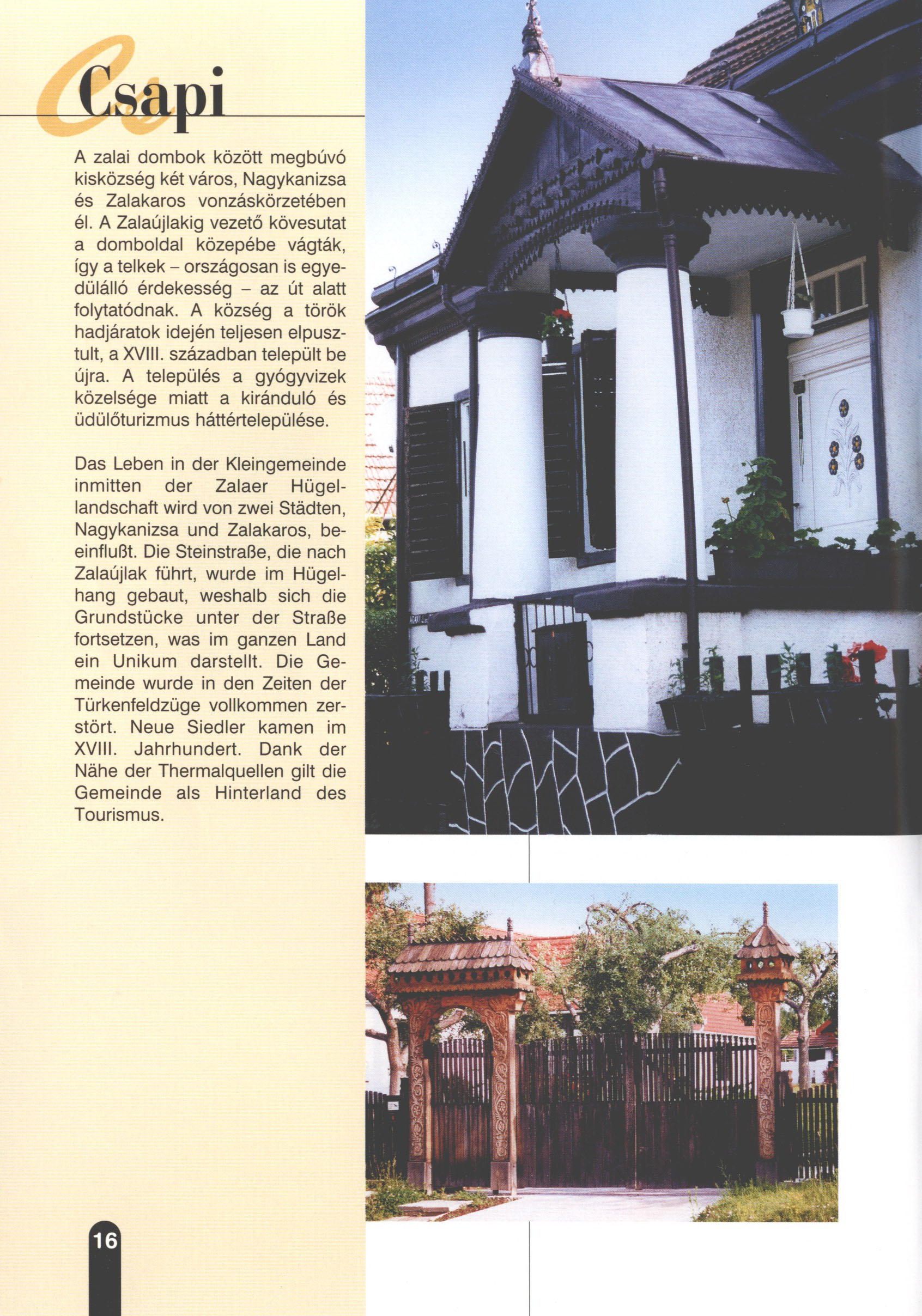 Nyilvános 2098 | 6216 | Csapi | Das Leben in der Kleingemeinde inmitten der Zalaer Hügellandschaft wird von zwei Städten, Nagykanizsa und Zalakaros, beeinflußt. Die Steinstraße, die nach Zalaújlak führt, wurde im Hügelhang gebaut, weshalb sich die Grundstücke unter der Straße fortsetzen, was im ganzen Land ein Unikum darstellt. Die Gemeinde wurde in den Zeiten der Türkenfeldzüge vollkommen zerstört. Neue Siedler kamen im XVIII. Jahrhundert. Dank der Nähe der Thermalquellen gilt die Gemeinde als Hinterland des Tourismus. Dieses Text stammt von: Titel: Hívogató a Régiók Kapujában - Útikönyv Látnivalók Nagykanizsán és Térségében (Einladend in dem Tor des Gebiets - Reisebuch - Sehenswürdigkeiten in Nagykanizsa und Umgebung) Herausgegeben von: Nagykanizsa és a Környező Települések Területfejlesztési Társulása (Verein für Gebietsentwicklung in Nagykanizsa und in ihrer Umgebung) 8800 Nagykanizsa, Petőfi Sándor út 5. Tel.: 06 93/536-453 • 06 93/536-454 Tel ./Fax: 06 93/326-323 E-mail: terstars@axelero.hu www.kanizsaterseg.celodin.hu |