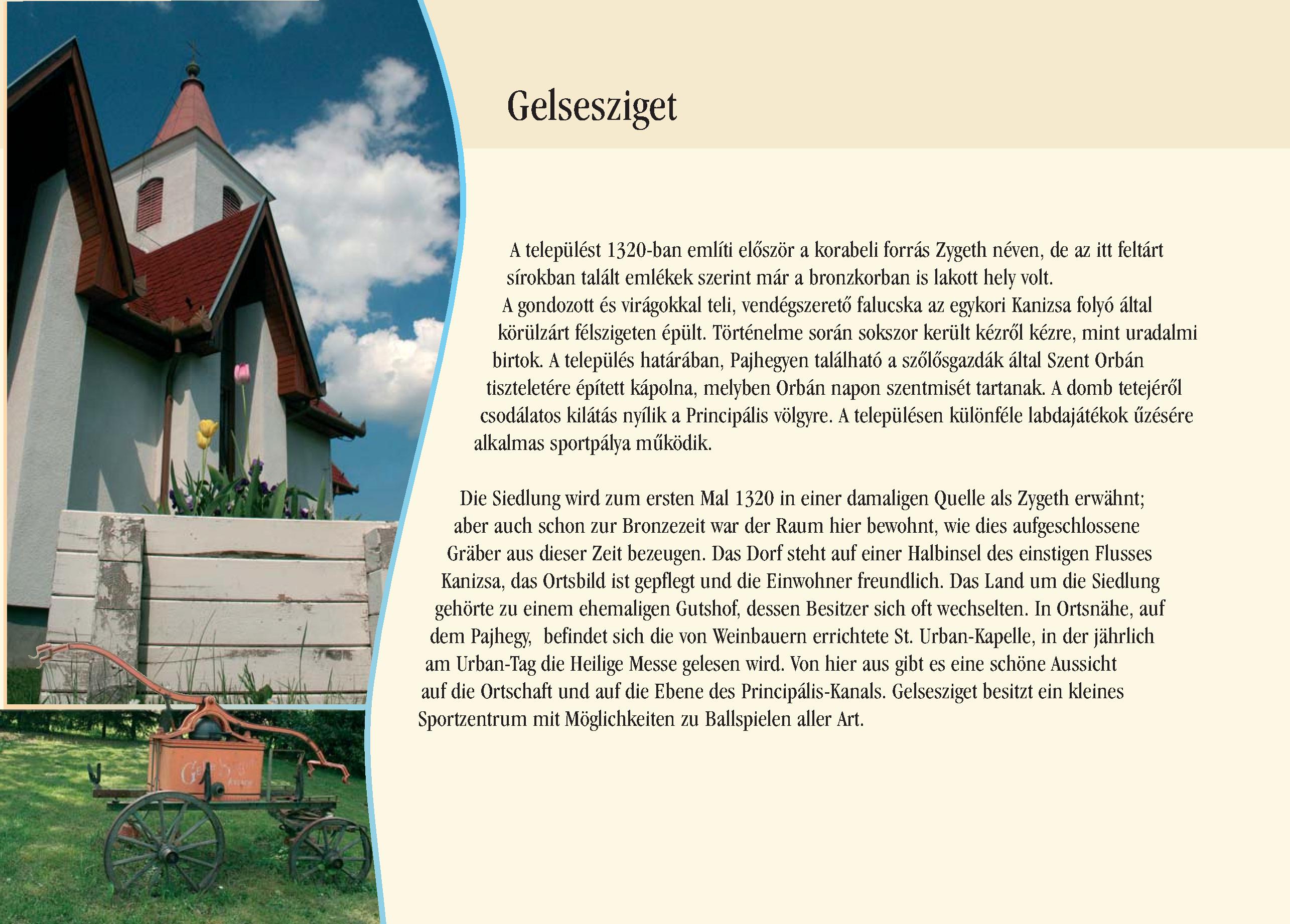 Nyilvános 2128 | 7750 | Gelsesziget | Die Siedlung wird zum ersten Mal 1320 in einer damaligen Quelle als Zygeth erwähnt; aber auch schon zur Bronzezeit war der Raum hier bewohnt, wie dies aufgeschlossene Gräber aus dieser Zeit bezeugen. Das Dorf steht auf einer Halbinsel des einstigen Flusses Kanizsa, das Ortsbild ist gepflegt und die Einwohner freundlich. Das Land um die Siedlung gehörte zu einem ehemaligen Gutshof, dessen Besitzer sich oft wechselten. In Ortsnähe, auf dem Pajhegy, befindet sich die von Weinbauern errichtete St. Urban-Kapelle, in der jährlich am Urban-Tag die Heilige Messe gelesen wird. Von hier aus gibt es eine schöne Aussicht auf die Ortschaft und auf die Ebene des Principális-Kanals. Gelsesziget besitzt ein kleines Sportzentrum mit Möglichkeiten zu Ballspielen aller Art. Dieses Text stammt von: Pannonhát tájpark prospektus 2006. Web: http://www.pannonhat.hu/ (auch in Deutsch) |