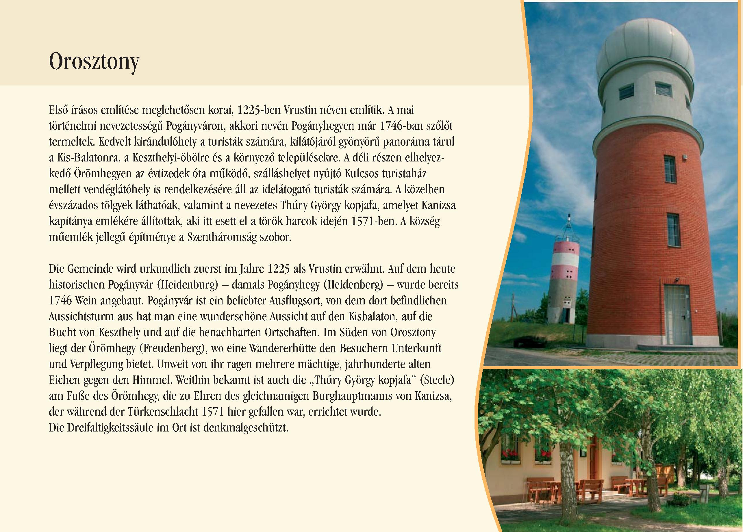 Nyilvános 2450 | 8414 | Orosztony | Die Gemeinde wird urkundlich zuerst im Jahre 1225 als Vrustin erwähnt. Auf dem heute historischen Pogányvár (Heidenburg) damals Pogányhegy (Heidenberg) wurde bereits 1746 Wein angebaut. Pogányvár ist ein beliebter Ausflugsort, von dem dort befindlichen Aussichtsturm aus hat man eine wunderschöne Aussicht auf den Kisbalaton, auf die Bucht von Keszthely und auf die benachbarten Ortschaften. Im Süden von Orosztony liegt der Örömhegy (Freudenberg), wo eine Wandererhütte den Besuchern Unterkunft und Verpflegung bietet. Unweit von ihr ragen mehrere mächtige, jahrhunderte alten Eichen gegen den Himmel. Weithin bekannt ist auch die ,,Thúry György kopjafa" (Steele) am Fuße des Örömhegy, die zu Ehren des gleichnamigen Burghauptmanns von Kanizsa, der während der Türkenschlacht 1571 hier gefallen war, errichtet wurde. Die Dreifaltigkeitssäule im Ort ist denkmalgeschützt. Dieses Text stammt von: Pannonhát tájpark prospektus 2006. Web: http://www.pannonhat.hu/ (auch in Deutsch) |