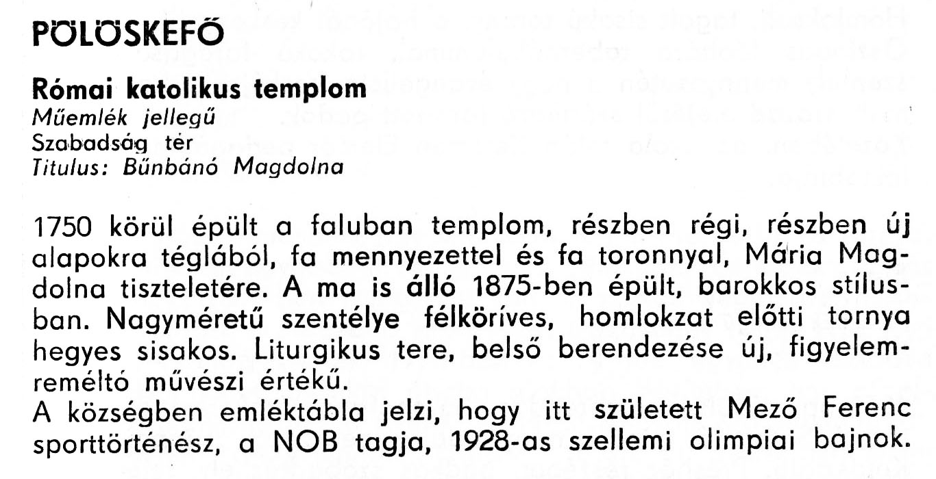 Nyilvános 2189 | 5430 | Pölöskefő - Zala megye műemlékei 1977 081old | A részlet szövege: PÖLÖSKEFÖ Római katolikus templom Műemlék jellegű Szabadság tér Titulus: Bűnbánó Magdolna 1750 körül épült a faluban templom, részben régi, részben új alapokra téglából, fa mennyezettel és fa toronnyal, Mária Magdolna tiszteletére. A ma is álló 1875-ben épült, barokkos stílusban. Nagyméretű szentélye félköríves, homlokzat előtti tornya hegyes sisakos. Liturgikus tere, belső berendezése új, figyelemreméltó művészi értékű. A községben emléktábla jelzi, hogy itt született Mező Ferenc sporttörténész, a NOB tagja, 1928-as szellemi olimpiai bajnok. A részlet a következő könyvből származik: Cím: Zala megye műemlékei Szerző: Németh József (1928) Közreműködő: Lantos Miklós (fotó) Szerz. közl.: Németh József ; [fotók... Lantos Miklós] Kiadás: Zalaegerszeg : Zalai Ny., 1977 ETO jelzet: 72(439.121) ; 7.025.3/.4 ; 908.439.121 Tárgyszó: Zala megye Szakjelzet: 908 Cutter: N 53 Nyelv: magyar Oldalszám: 109 p. |