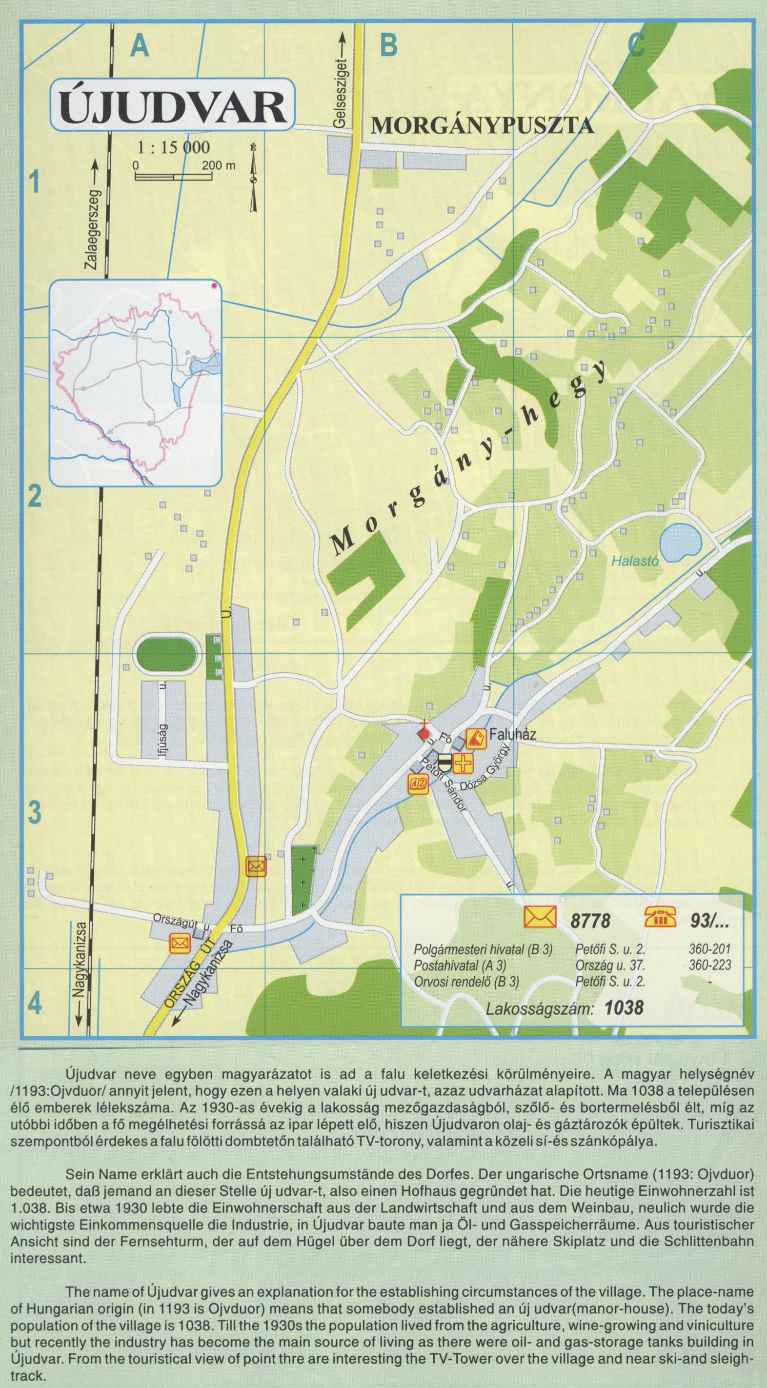 Nyilvános 2136 | 5687 | ÚJUDVAR | Újudvar neve egyben magyarázatot is ad a falu keletkezési körülményeire. A magyar helységnév /1193:Ojvduor/ annyit jelent, hogy ezen a helyen valaki új udvar-t, azaz udvarházat alapított. Ma 1038 a településen élő emberek lélekszáma. Az 1930-as évekig a lakosság mezőgazdaságból, szőlő- és bortermelésből élt, míg az utóbbi időben a fő megélhetési forrássá az ipar lépett elő, hiszen Újudvaron olaj- és gáztározók épültek. Turisztikai szempontból érdekes a falu fölötti dombtetőn található TV-torony, valamint a közeli sí-és szánkópálya. Sein Name erklärt auch die Entstehungsumstände des Dorfes. Der ungarische Ortsname (1193: Ojvduor) bedeutet, daß jemand an dieser Stelle új udvar-t, also einen Hofhaus gegründet hat. Die heutige Einwohnerzahl ist 1.038. Bis etwa 1930 lebte die Einwohnerschaft aus der Landwirtschaft und aus dem Weinbau, neulich wurde die wichtigste Einkommensquelle die Industrie, in Újudvar baute man ja Öl- und Gasspeicherräume. Aus touristischer Ansicht sind der Fernsehturm, der auf dem Hügel über dem Dorf liegt, der nähere Skiplatz und die Schlittenbahn interessant. The name of Újudvar gives an explanation for the establishing circumstances of the village. The place-name of Hungarian origin (in 1193 is Ojvduor) means that somebody established an új udvar(manor-house). The today\'s population of the village is 1038. Till the 1930s the population lived from the agriculture, wine-growing and viniculture but recently the industry has become the main source of living as there were oil- and gas-storage tanks building in Újudvar. From the touristical view of point thre are interesting the TV-Tower over the village and near ski-and sleigh-track. A részlet a következő kiadványból származik/Die Teile stammen vom volgenden Buch/This text came from the following book: Cím/Titel/Title: Zala megye településeinek atlasza - 257 település részletes térképe/Atlas der Komitat Zala - 257 Detailte Siedlungskarten/Zala county\'s Atlas - 257 settlement maps. Közreműködő/contributor: Lackner László (1943) (fotó) Kiadás/Ausgabe/Publisher: Gyula : HISZI-MAP, 1997 Sorozat/Serie/Series: Indulástól - megérkezésig... ETO: 912(439.121-2) ; 908.439.121 Cutter: Z 19 ISBN: 963-610-025-4 Oldalszám/Seiten/Pages: 323, 81 p. Megjegyzés/Note: Lezárva/Abgeschlossen am/Closed am: 1997. máj. 30. |